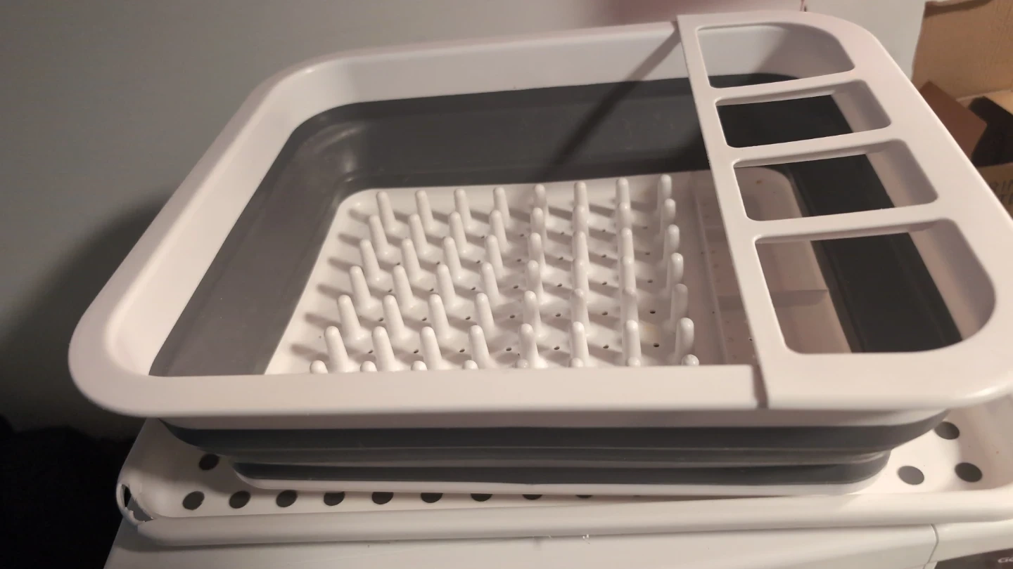 Selling a collapsible dish drying rack in great condition! It's a convenient space-saver for any kitchen. The rack features a white frame with grey accents and includes sections for plates, utensils, and more. Perfect for small spaces or when you need extra drying space
