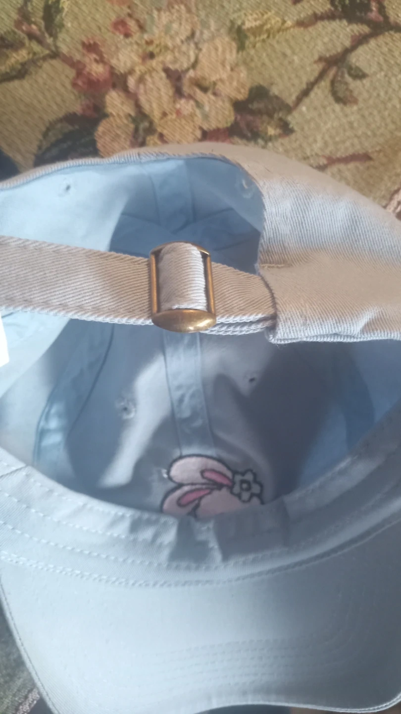 This baseball cap is made of 100% cotton. It features a cute embroidered bunny on the front. The adjustable strap ensures a comfortable fit for most sizes.