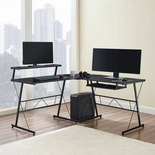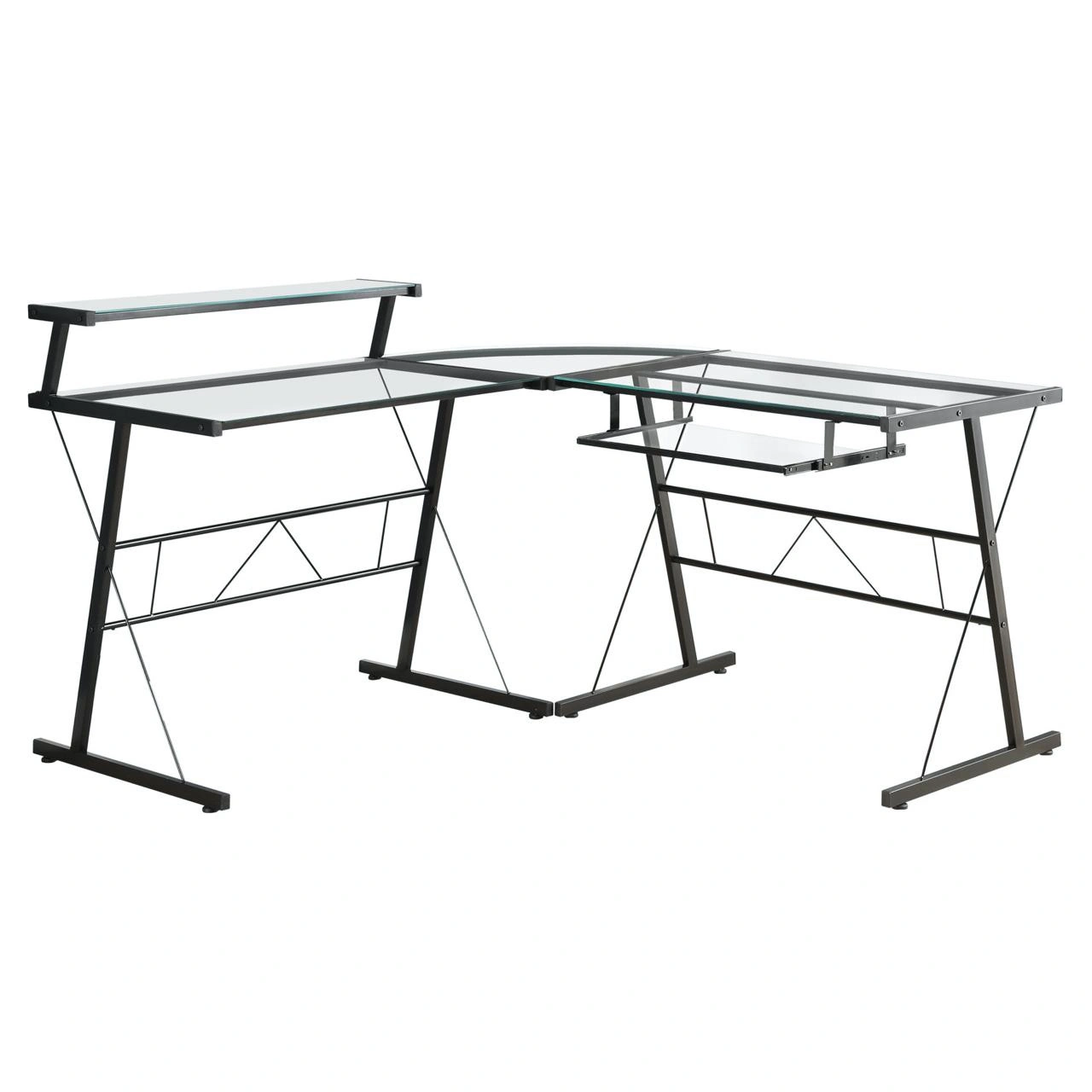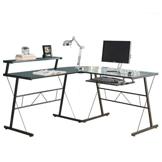 Perfect for a home office! It’s got a durable metal frame and tempered glass surfaces that give it a modern look. The L-shape fits great in corners to save space. Comes with a raised monitor stand and a pull-out keyboard tray for a comfy setup.