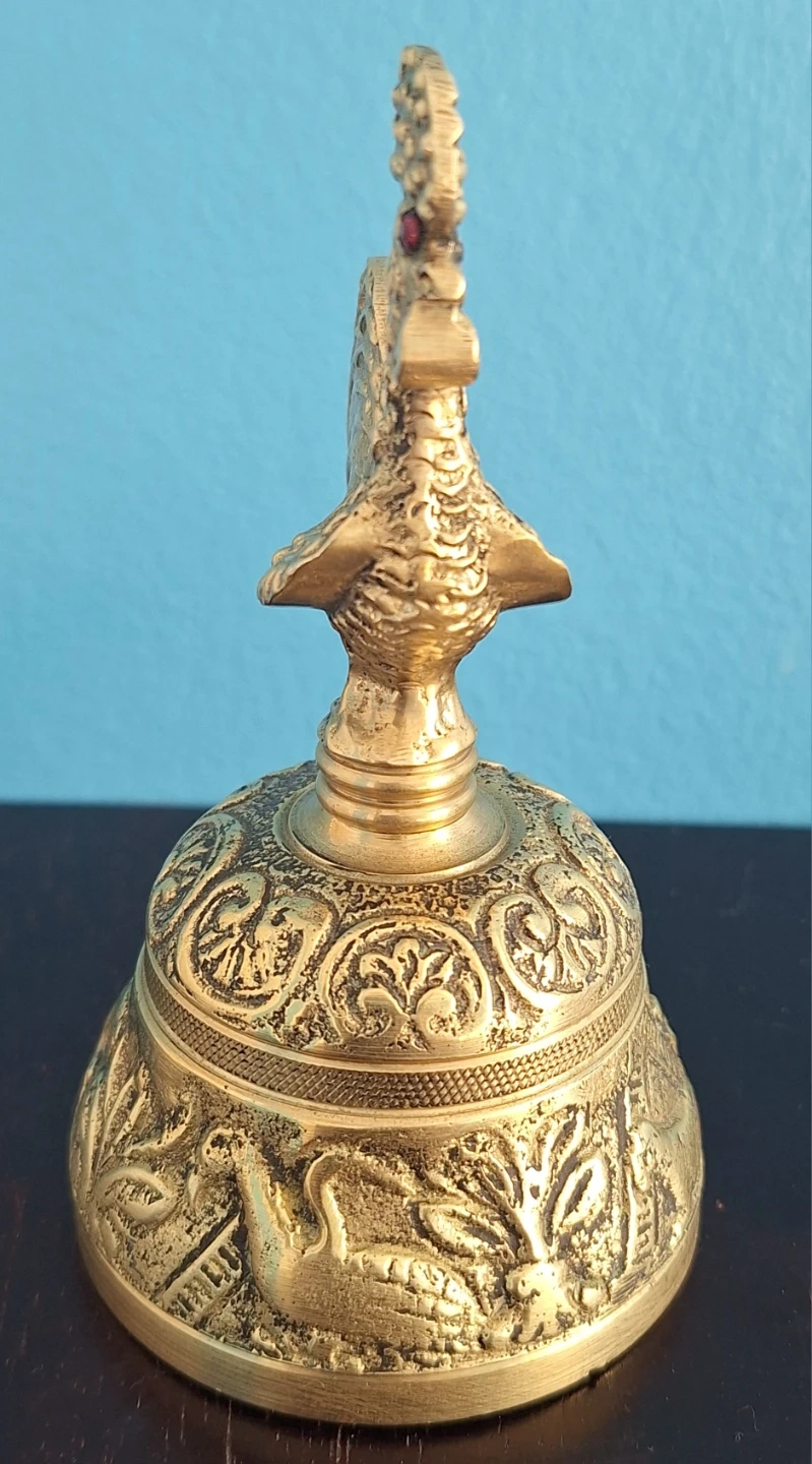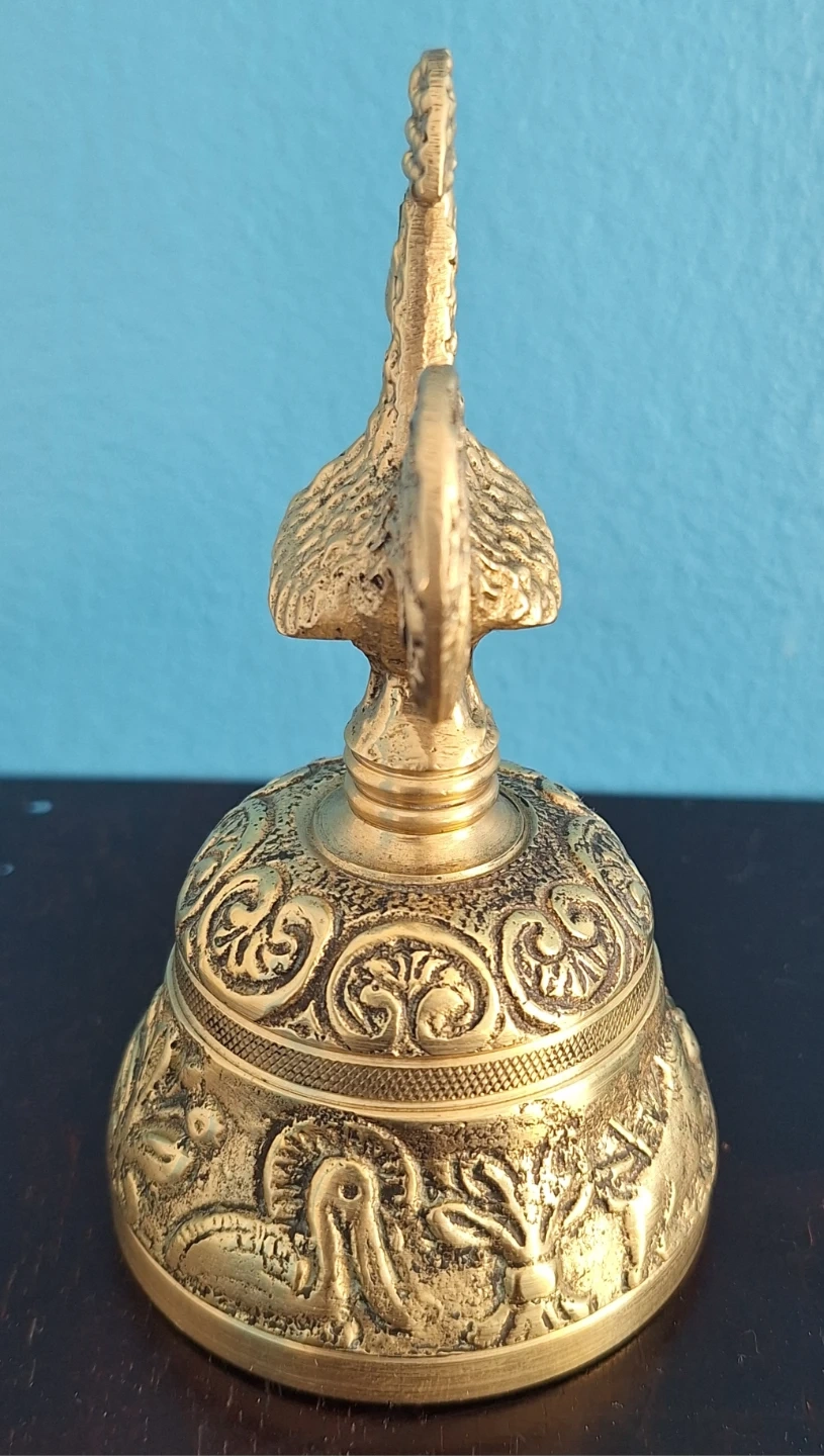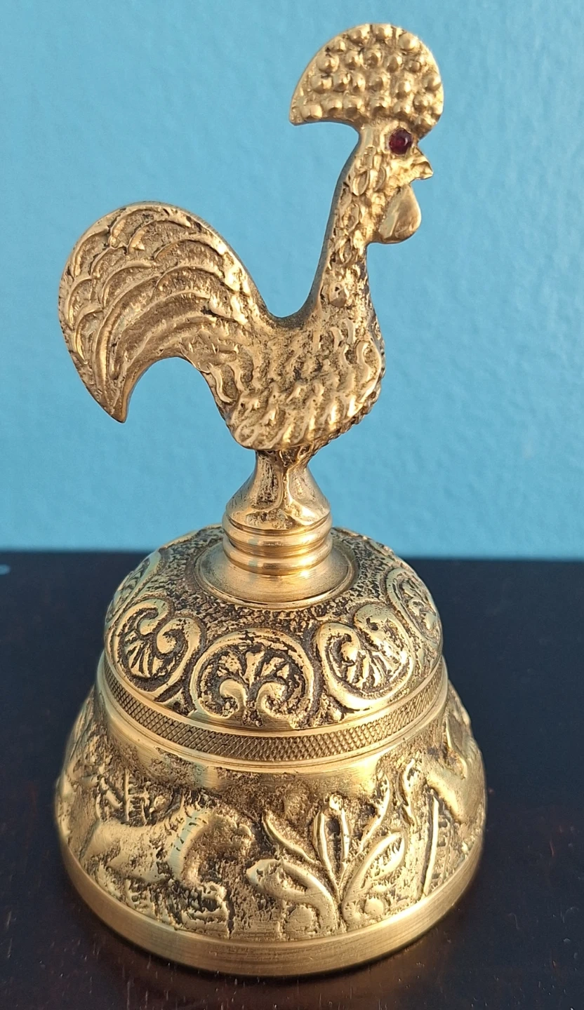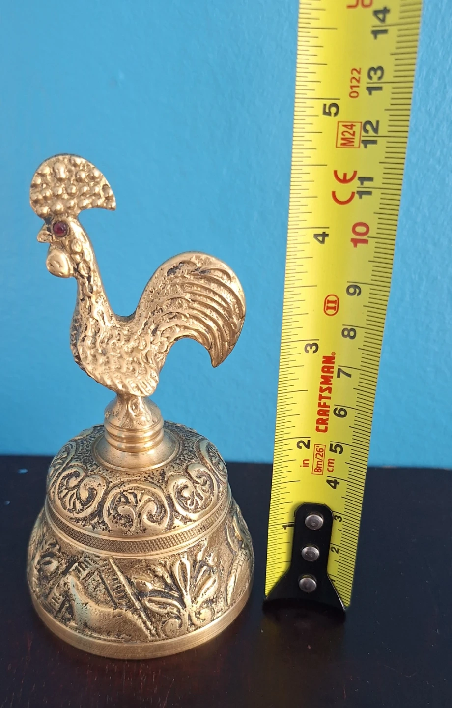 Decorative brass bell with a detailed rooster top. It's embossed with intricate patterns and animal scenes around the base. Also calked dinner bell.Really high quality item.