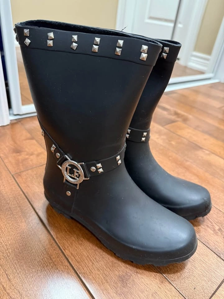 Stylish London Fog waterproof rubber boots. Black with cool studded design and a silver buckle that has the LF logo. Size 37. Great for rainy days!