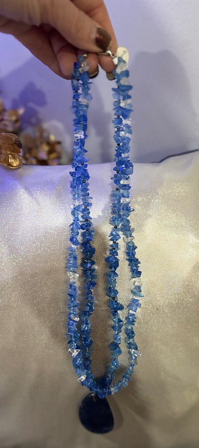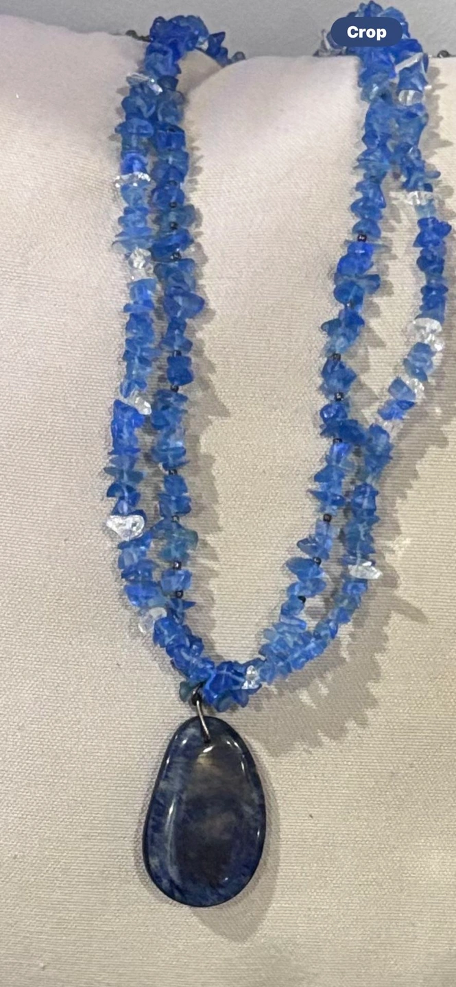 Beautiful blue quartz chip necklace featuring a smooth polished stone pendant. This piece is hand-strung with layered blue and clear quartz chips that create a rich, ocean-inspired look. The pendant adds a bold yet elegant finish, making it perfect for both casual and dressy outfits. Length: approx. 12 inches from clasp to bottom of pendant. Color: blue with natural variations. Closure: silver-tone lobster clasp. Style: statement / boho / artisan. Construction: hand-strung. Material: quartz (chips + polished stone). Each stone varies naturally in color and shape, making this necklace truly one of a kind. Pre-owned, in very good condition. Clean and ready to wear. Perfect for layering or wearing alone as a statement piece.
