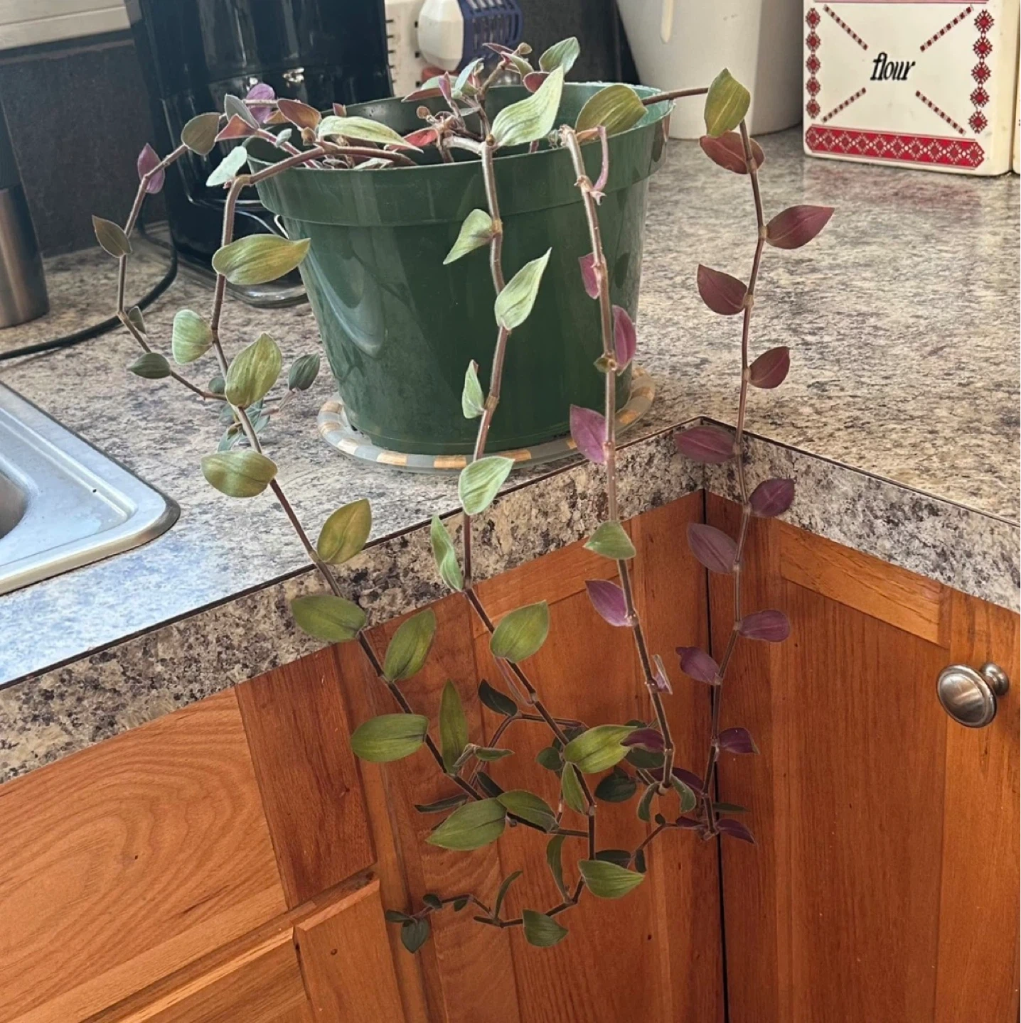 This plant has trailing vines with green and purple leaves. It's potted in a standard green plastic pot with a decorative base. It's a lovely addition for bringing some greenery indoors!