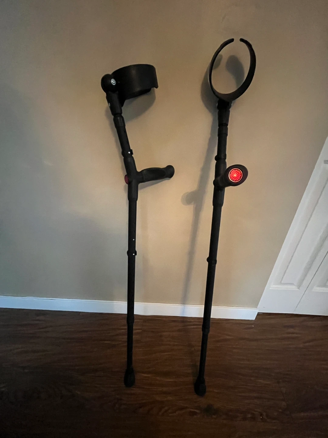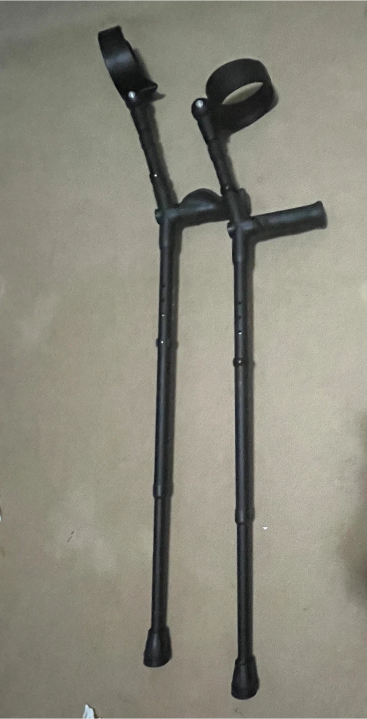 A pair of black forearm crutches, adjustable in height. These forearm crutches feature ergonomic handles and comfortable forearm cuffs. They're built for mobility support and rehabilitation needs.