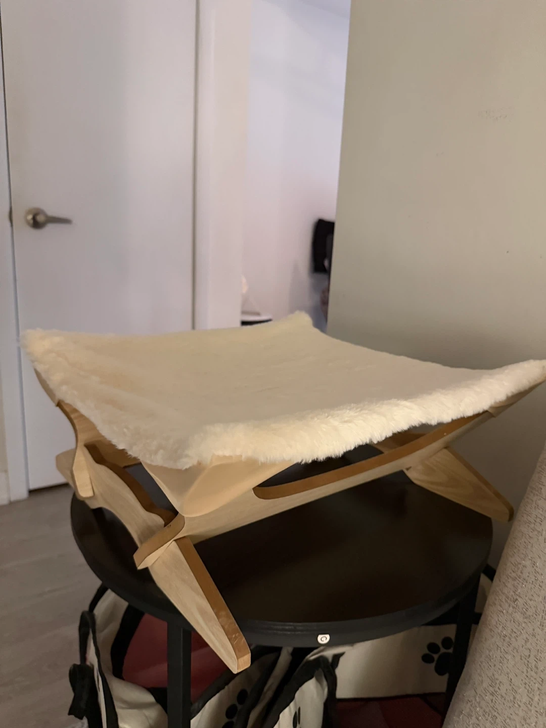 This cat hammock bed features a cozy cream faux fur cushion on a natural wood frame. It's designed for comfort and style in any room. Provides a comfy spot for your cat to lounge!