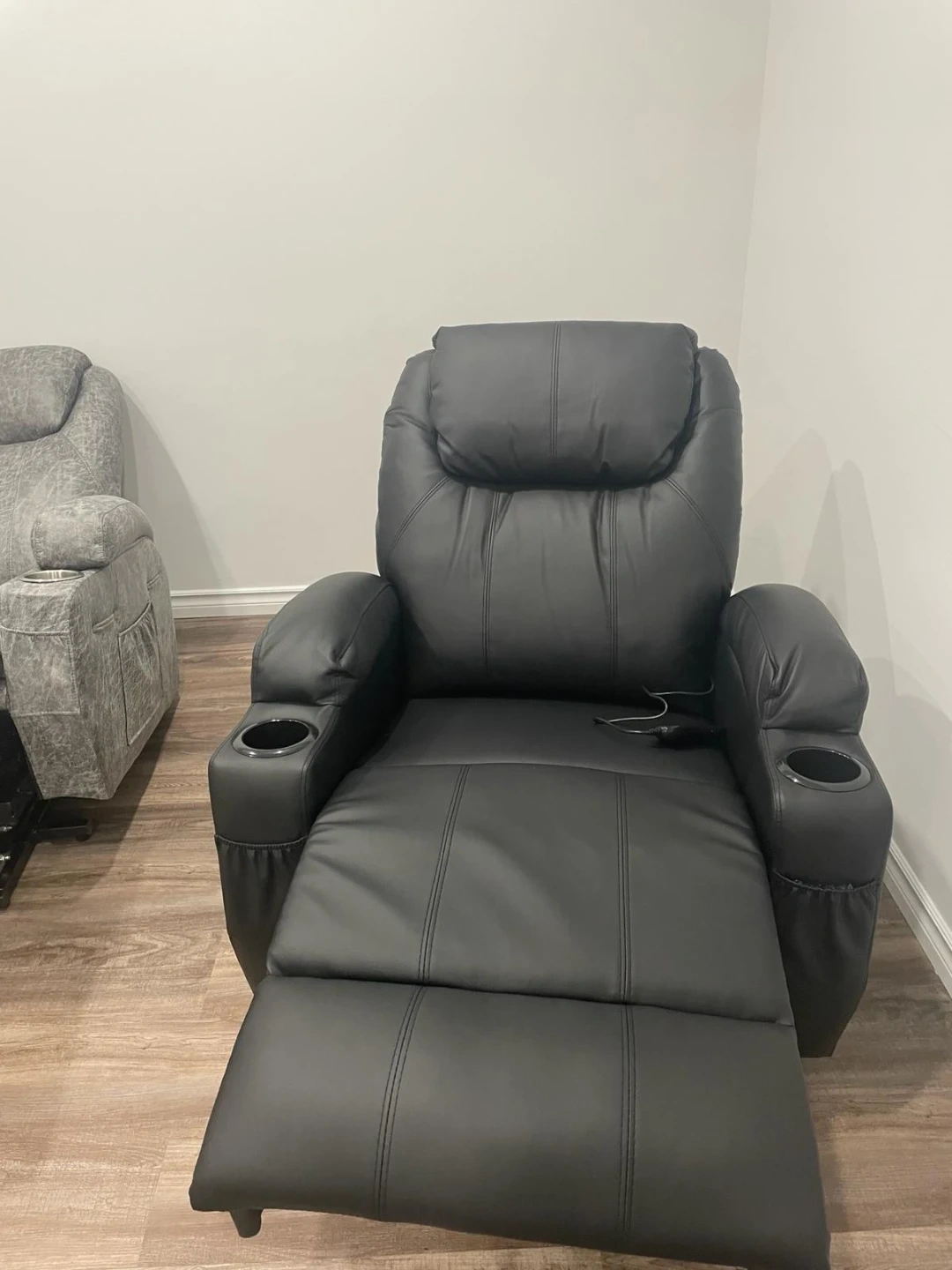 Black faux leather power recliner chair with 8 point massager and swivel action.