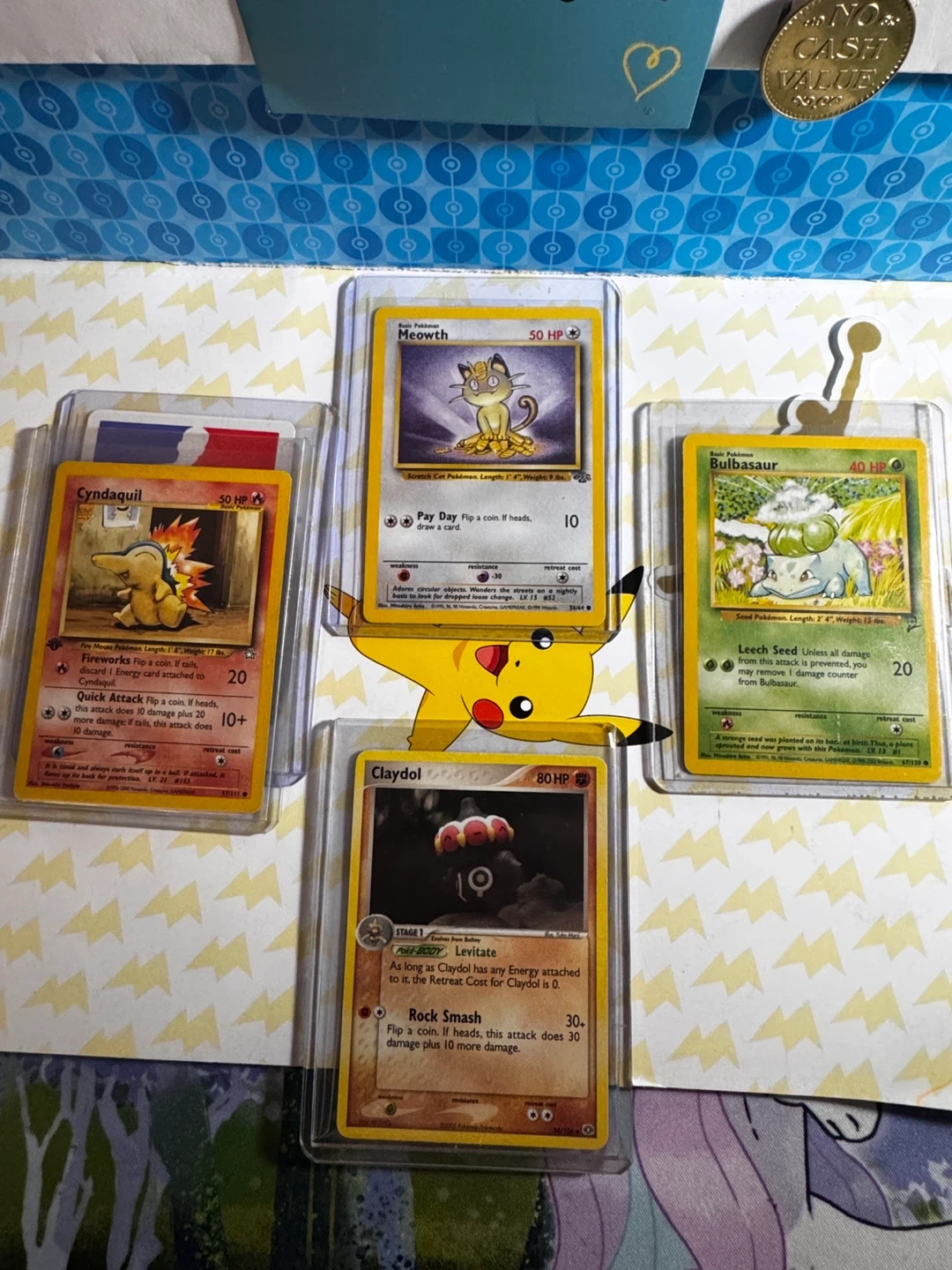 Four Pokemon trading cards are featured, including Cyndaquil, Meowth, Bulbasaur, and Claydol. Each card is housed in a protective sleeve.