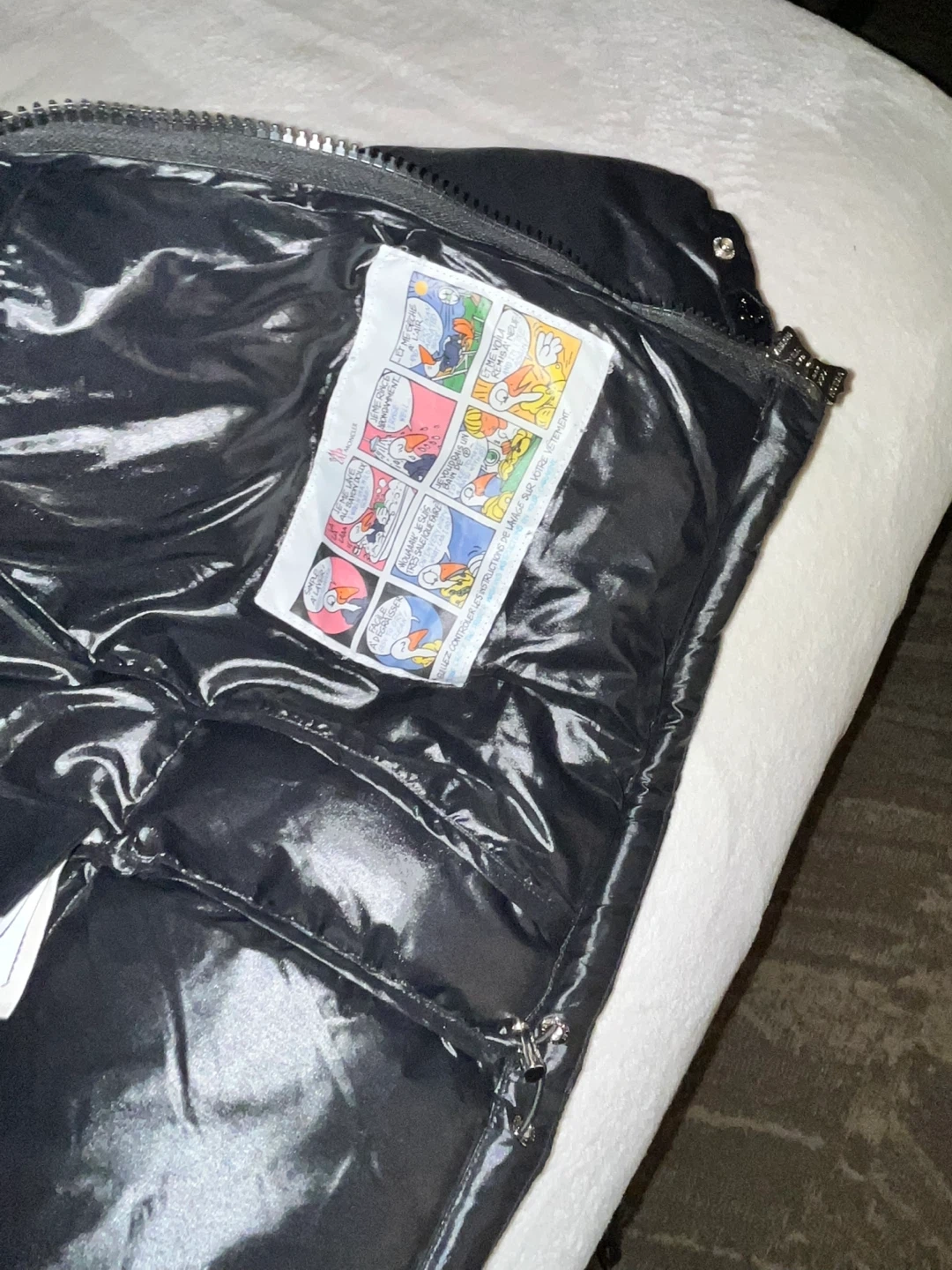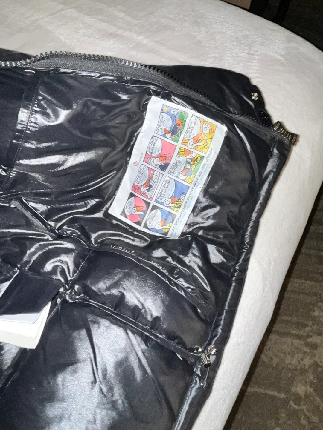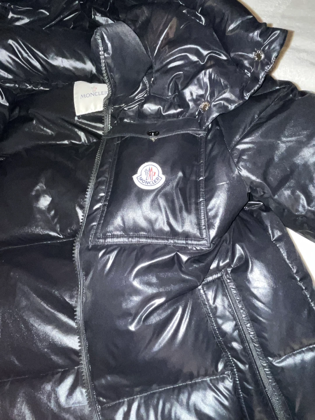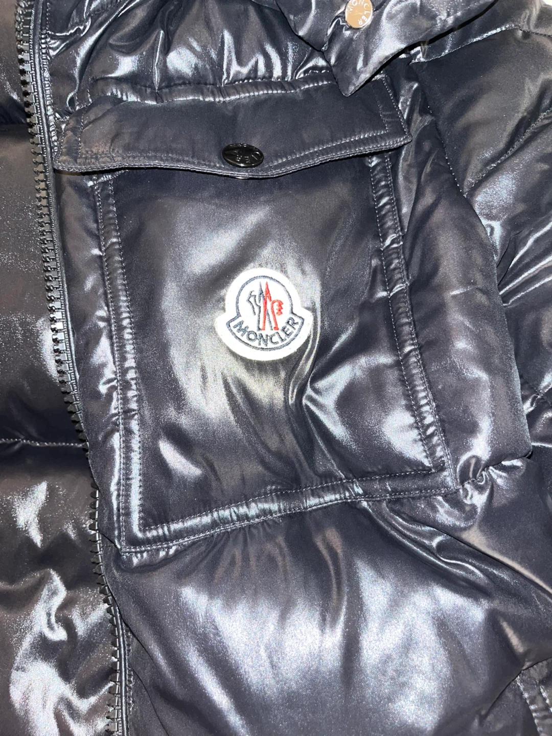 This is a shiny black Moncler puffer jacket. It features the iconic Moncler logo on the chest pocket. A red, white, and blue stripe accents the front zipper. This jacket is well-insulated and perfect for cold weather!