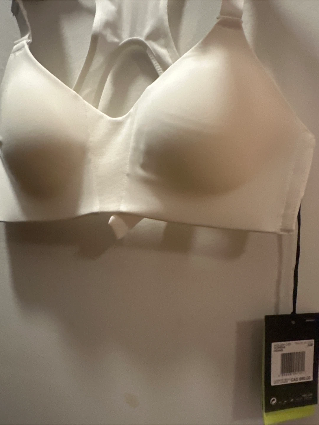 This is a Nike women's sports bra in a light beige colour. It's made of a soft, stretchy fabric for comfort. The bra offers good support. It's perfect for everyday wear or light workouts.