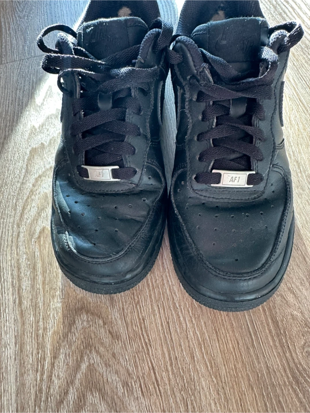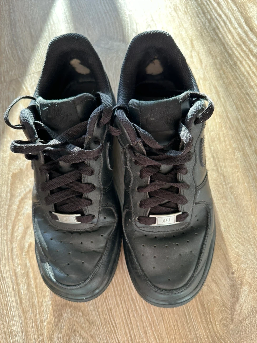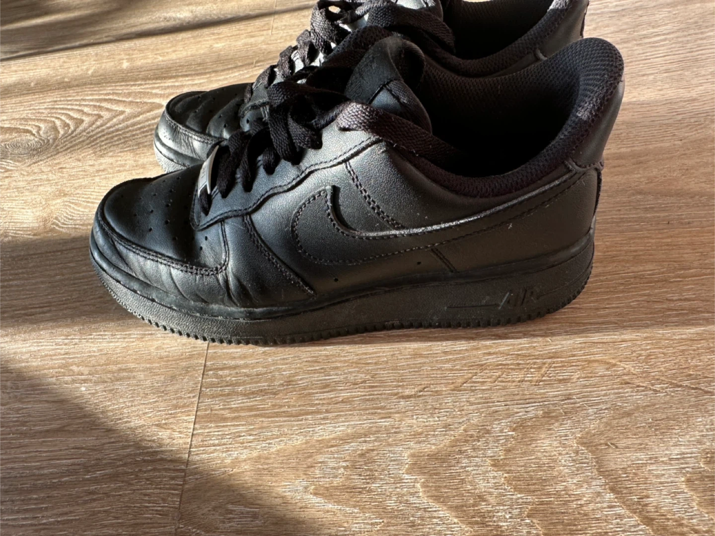 Classic black Nike Air Force 1 sneakers. These low-top kicks offer a timeless style. Leather upper with rubber sole for durability. Perfect for everyday wear or a sporty look!