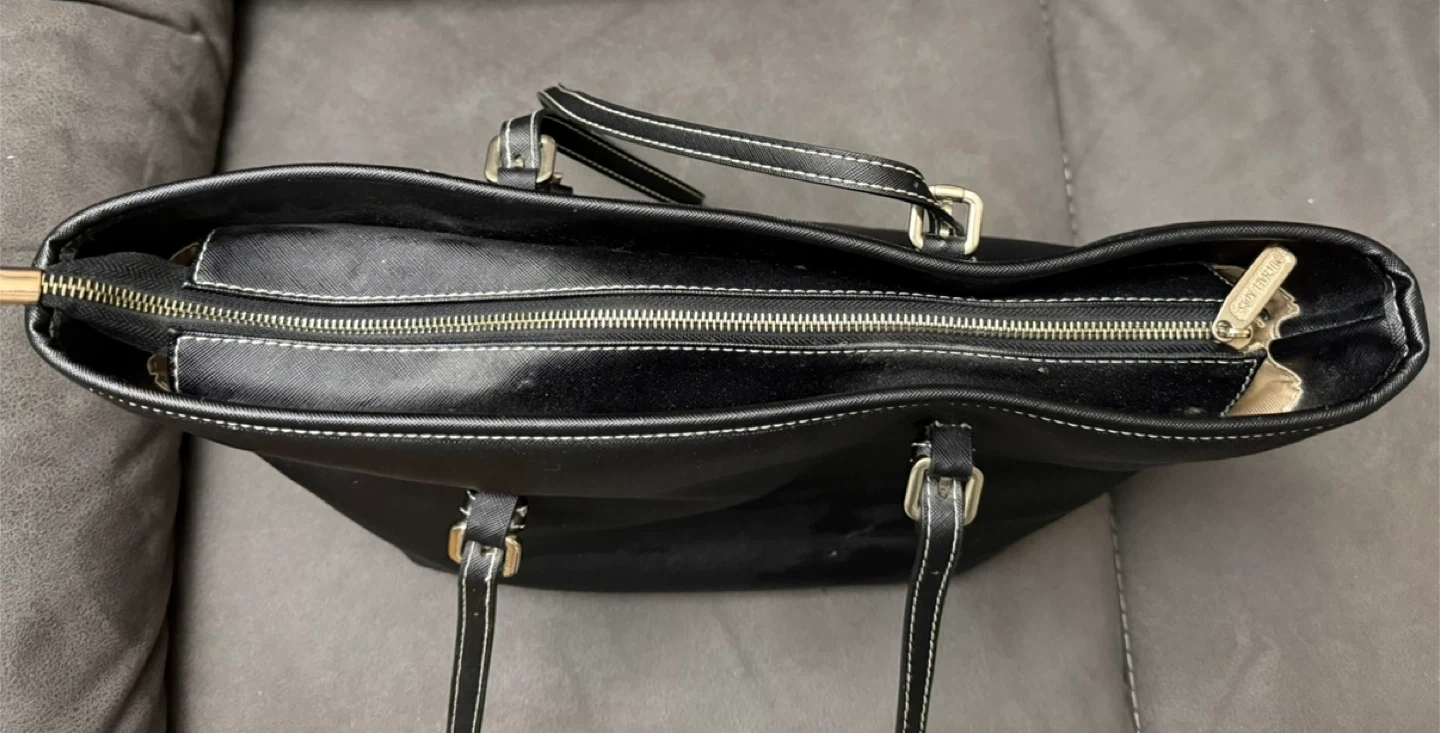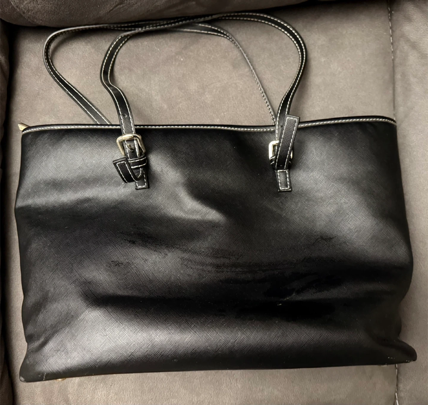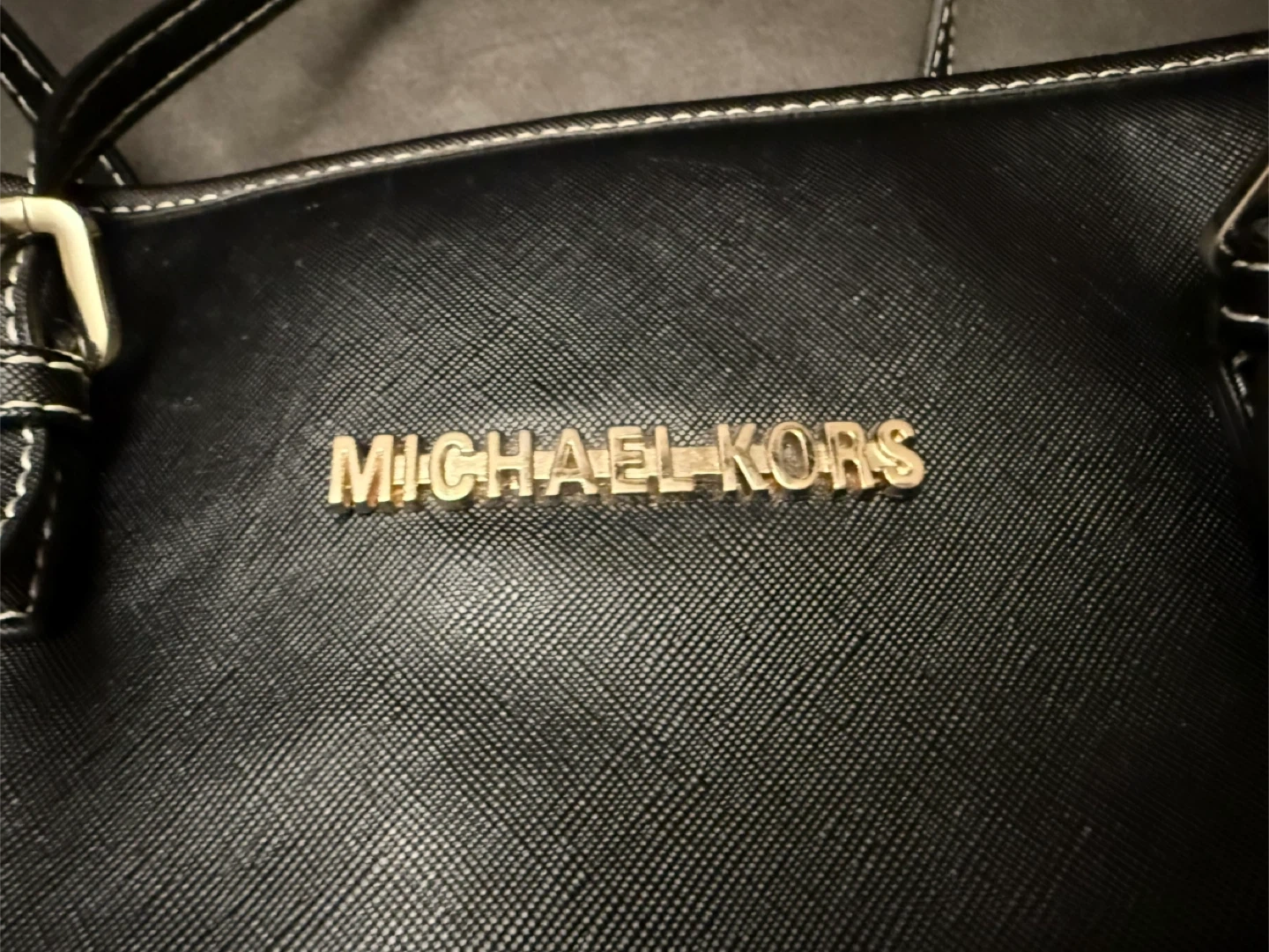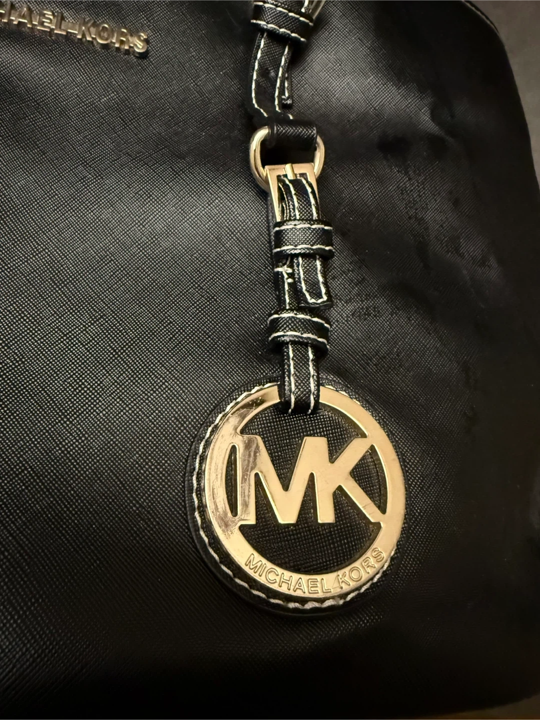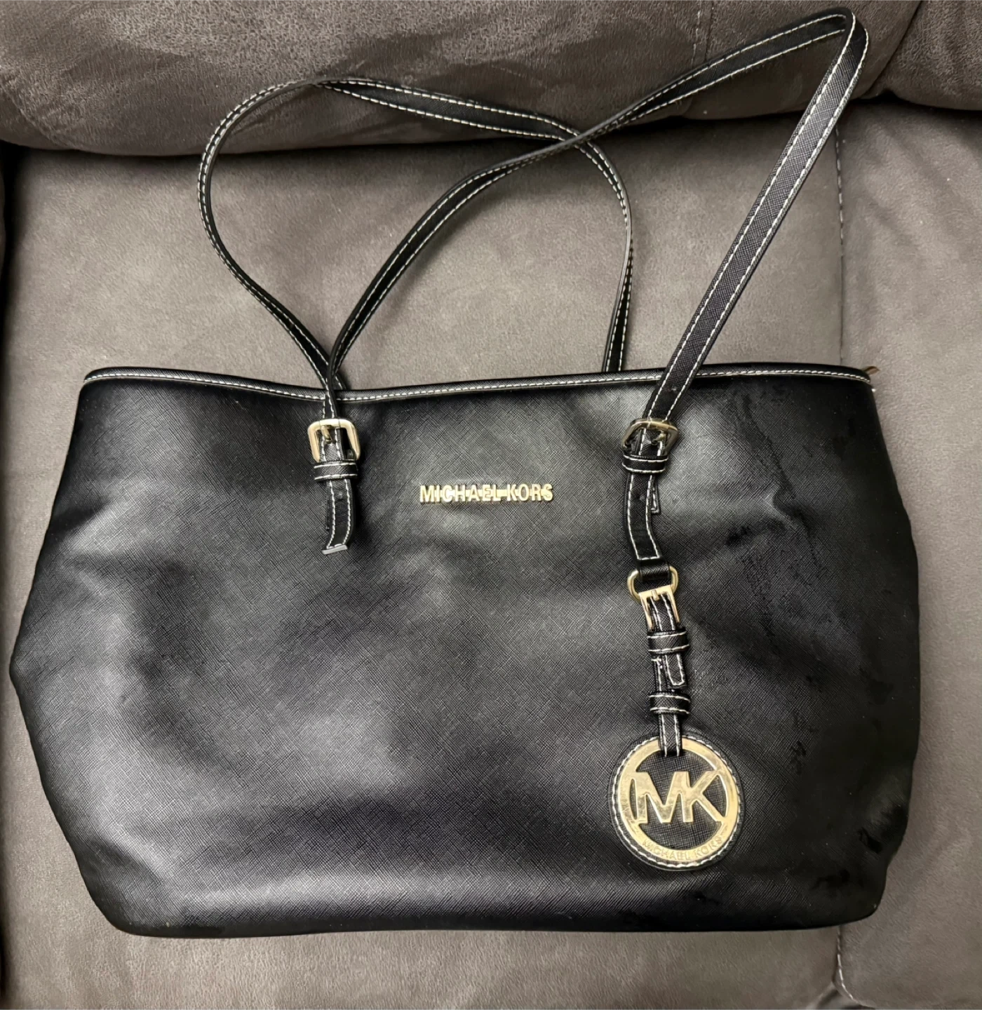 A classic black tote bag from Michael Kors. It's made of durable Saffiano leather and features signature gold-tone hardware. This spacious bag is perfect for everyday use, carrying essentials with ease.