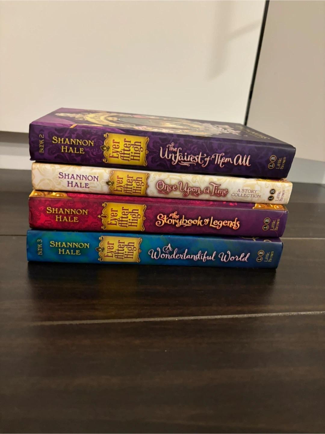 This set includes four Shannon Hale books from the Ever After High series. Titles are: The Unfairest of Them All, Once Upon a Time A Story Collection, The Storybook of Legends, and A Wonderlandiful World. These books are perfect for fans of the Ever After High series!
