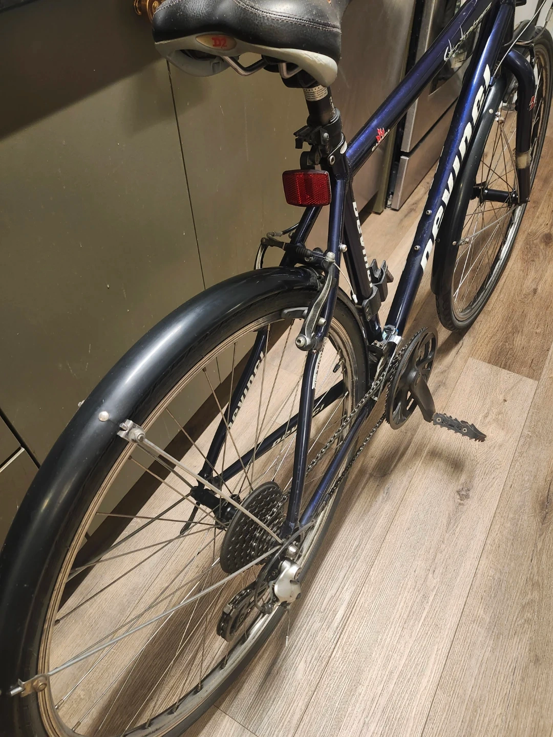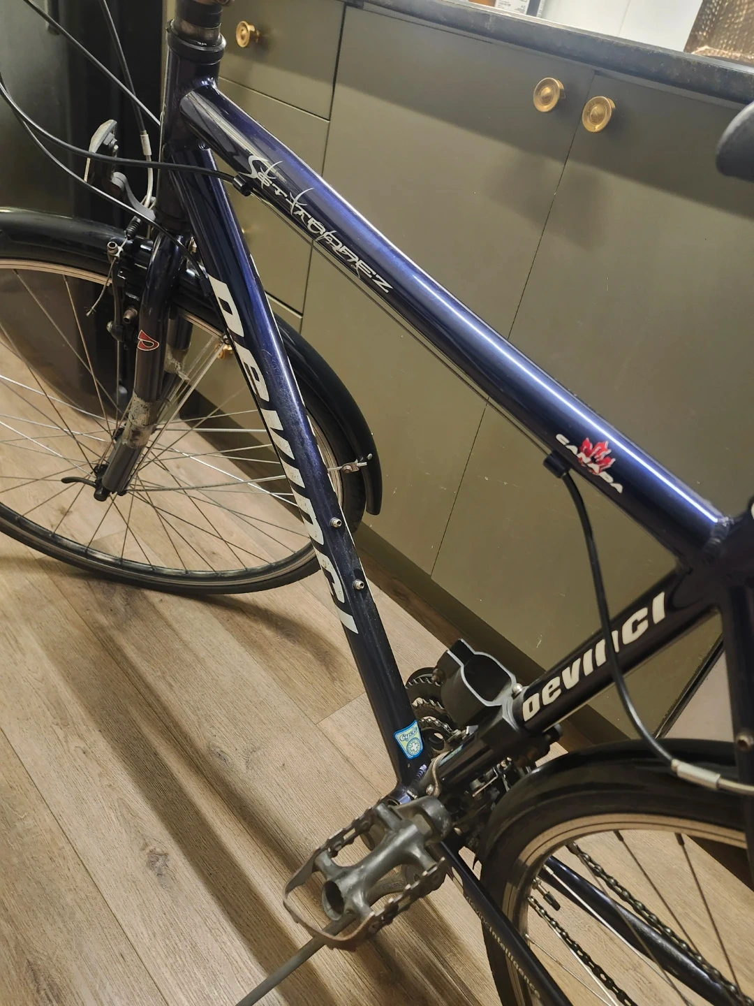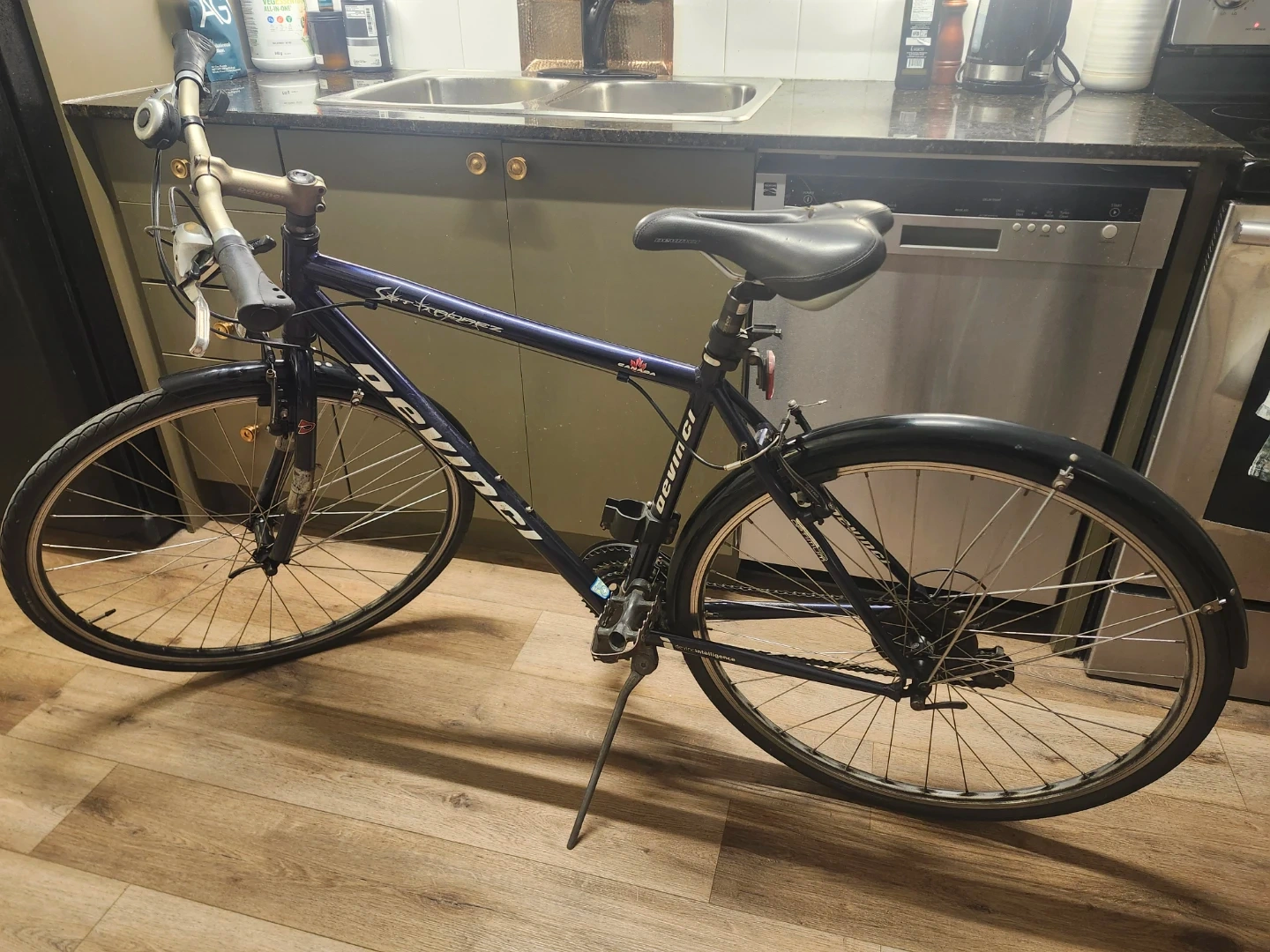 This is a Devinci St. Tropez hybrid bicycle. It is in great condition amd includes extras. Everything works as it should. A solid made in canada hybrid / city commuter bike. Comes with a U lock and a cable lock. Also includes a nice Shwinn bike tire pump, and a brand new helmet with Safety light. Asking 350 obo for everything.