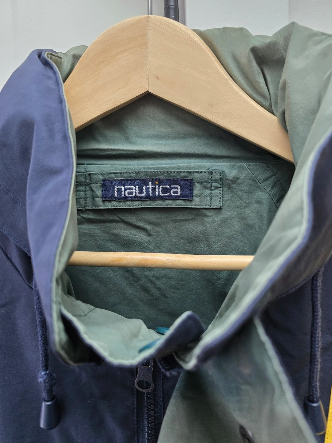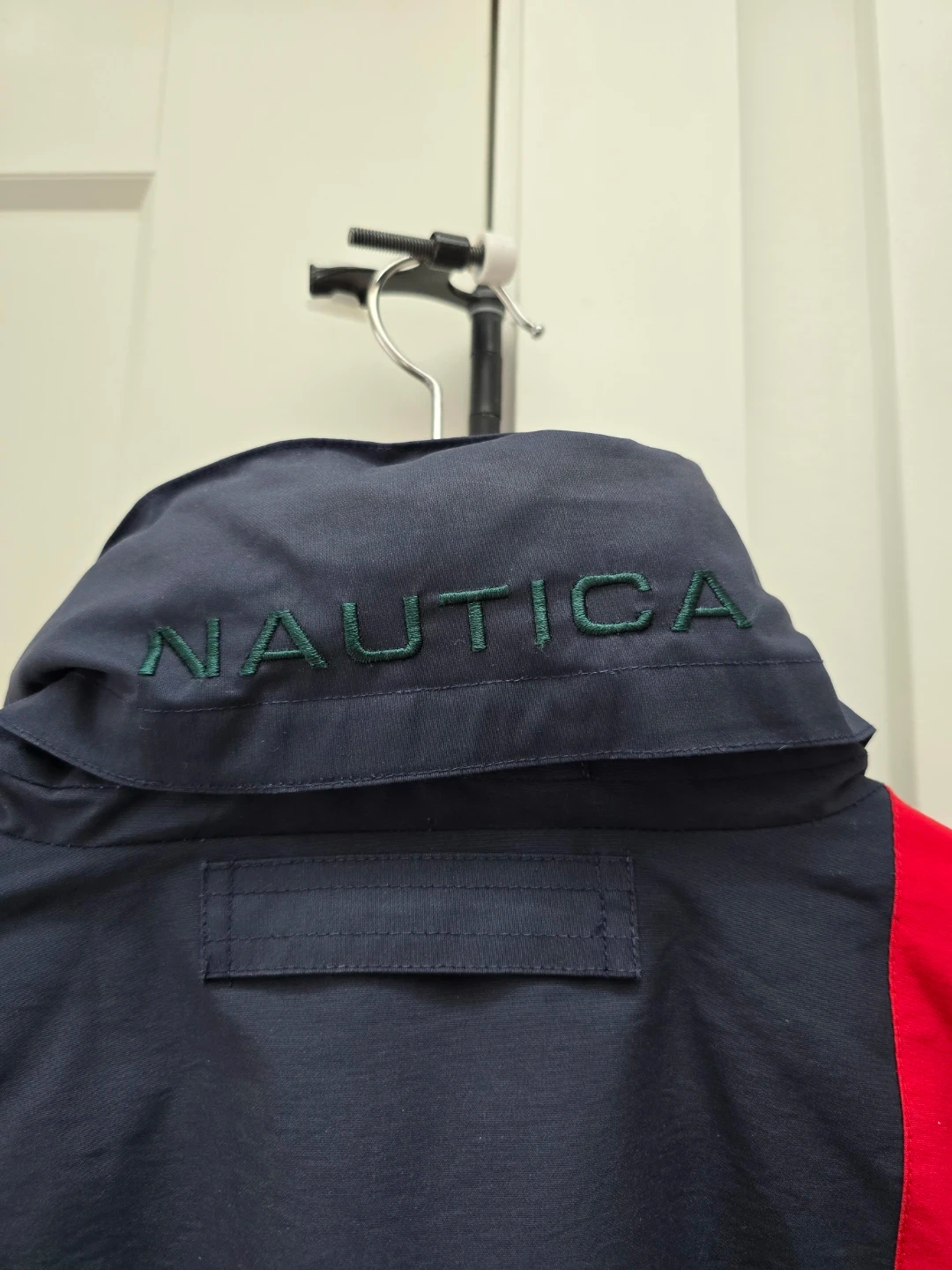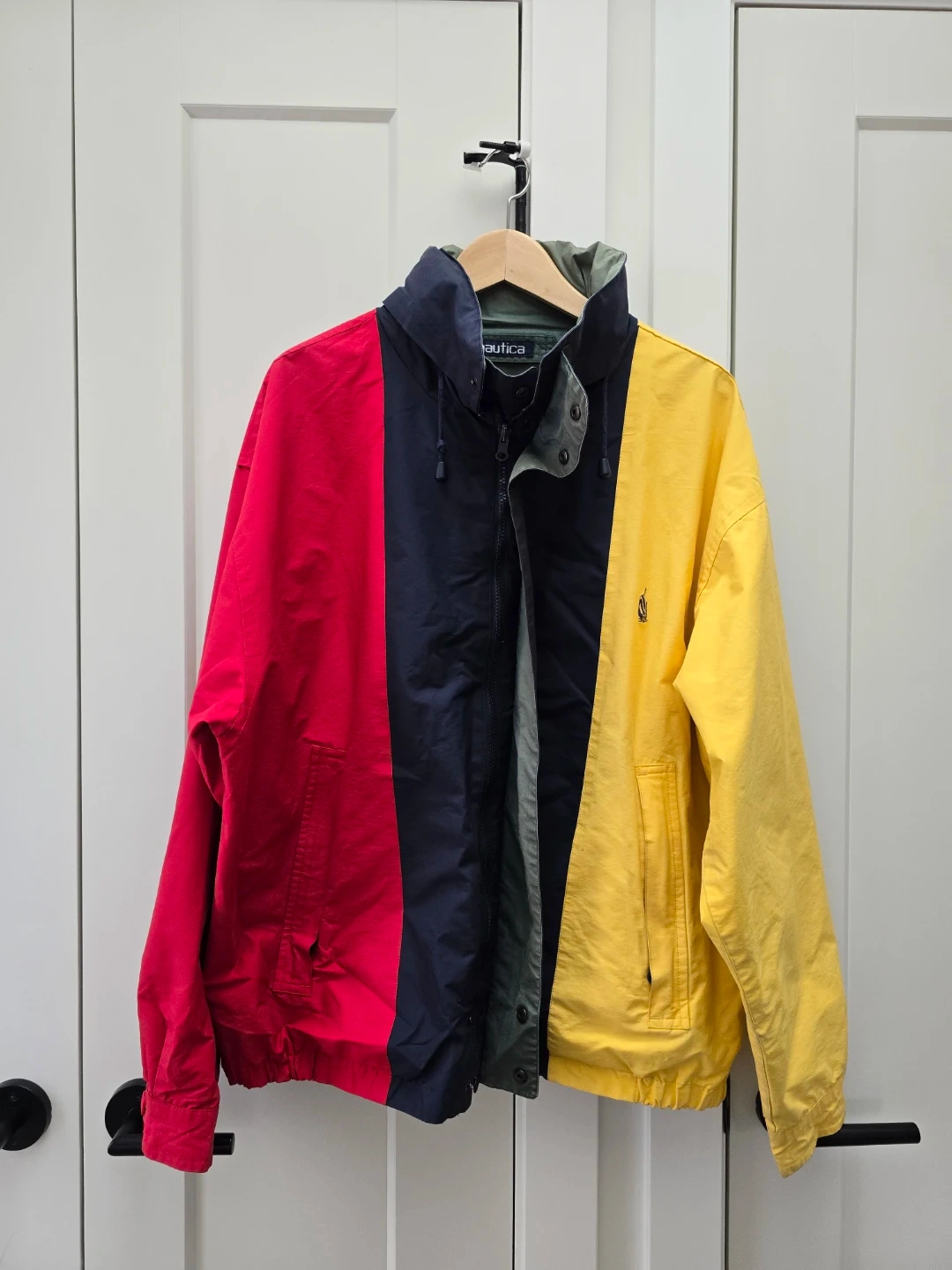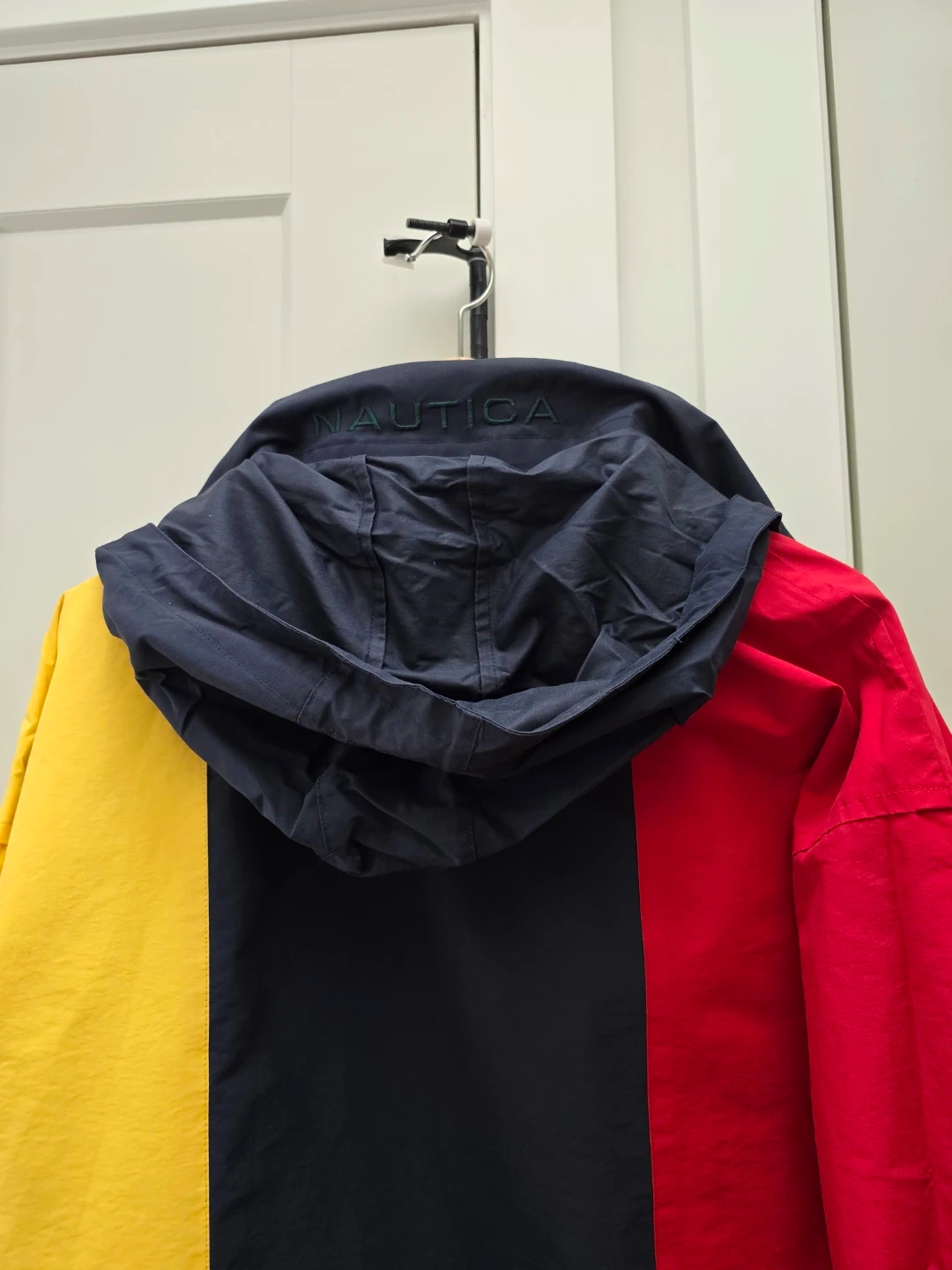 This Nautica jacket features a bold colour block design with red, navy, and yellow panels. It's a classic windbreaker style. It would be great for cooler spring or fall days!