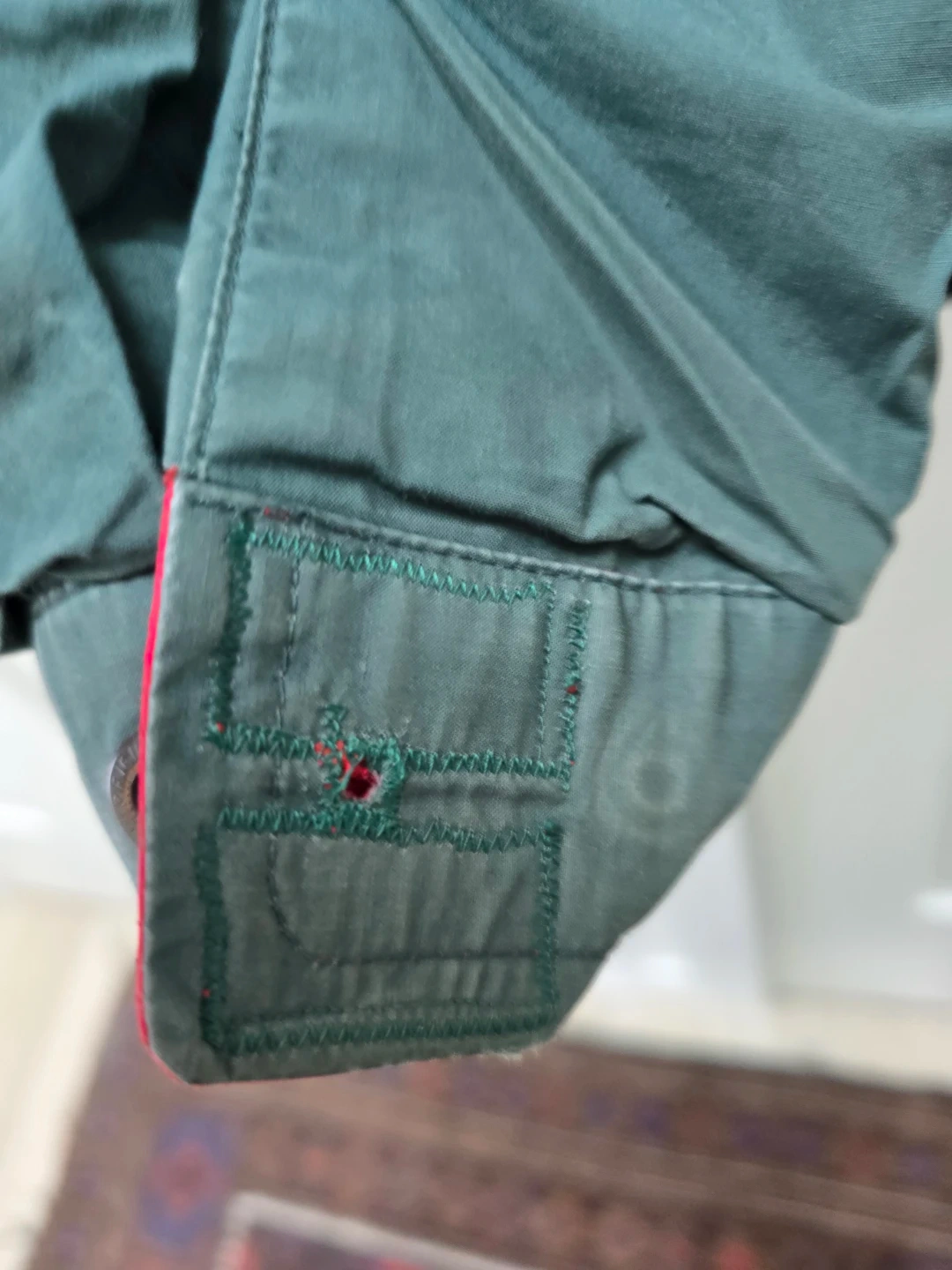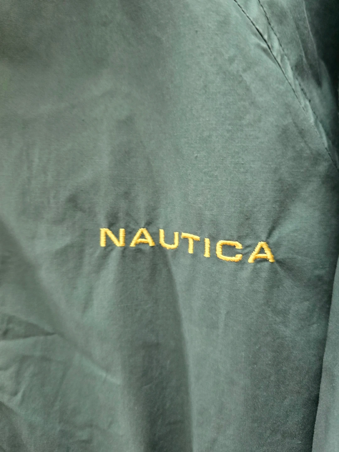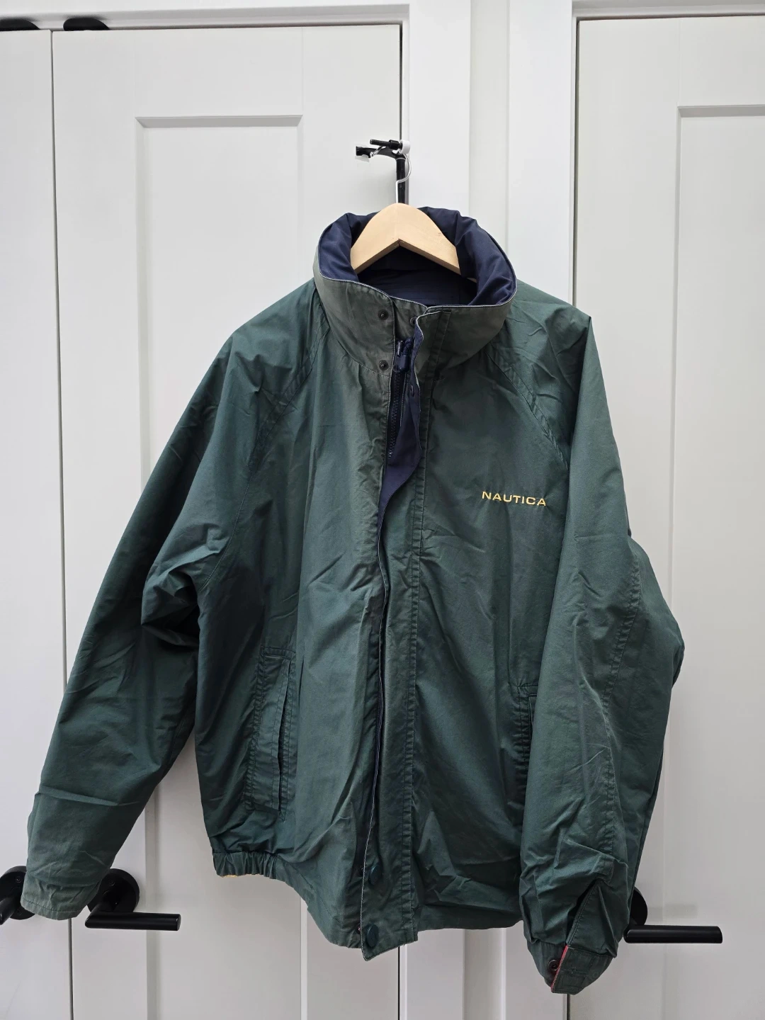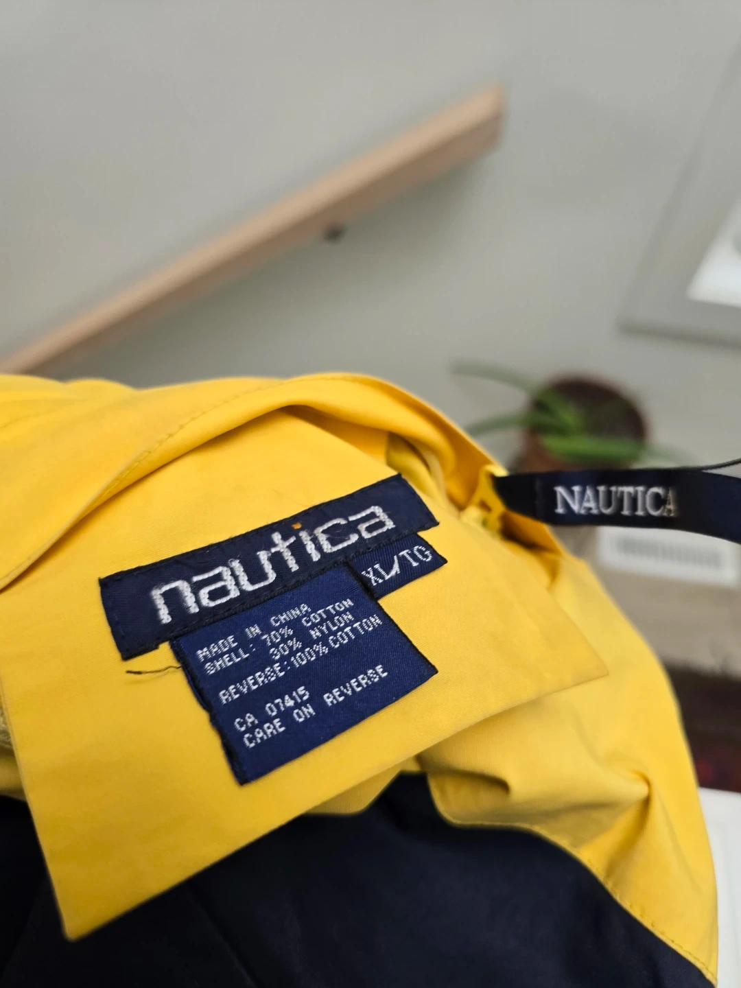 This Nautica jacket features a bold colour block design with red, navy, and yellow panels. It's a classic windbreaker style. It would be great for cooler spring or fall days!