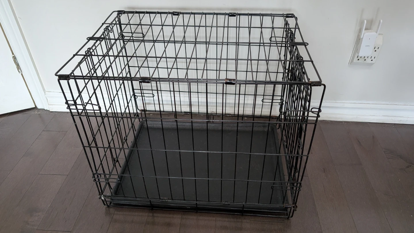 This is a wire pet(dog/cat) crate / Cage with a removable black plastic tray. It's suitable for small to medium-sized dogs. The crate folds flat for storage. It's a handy item for training or travel!