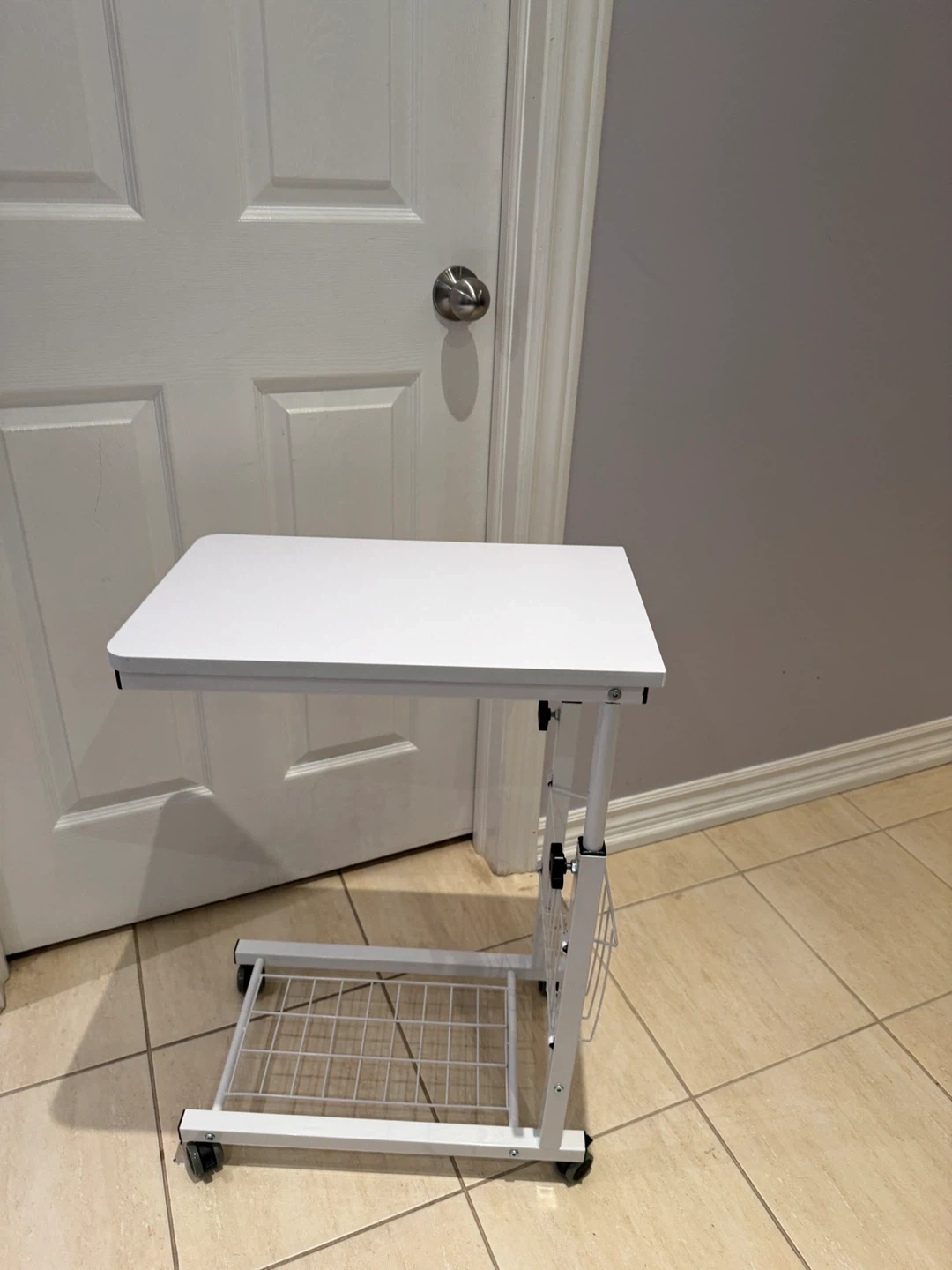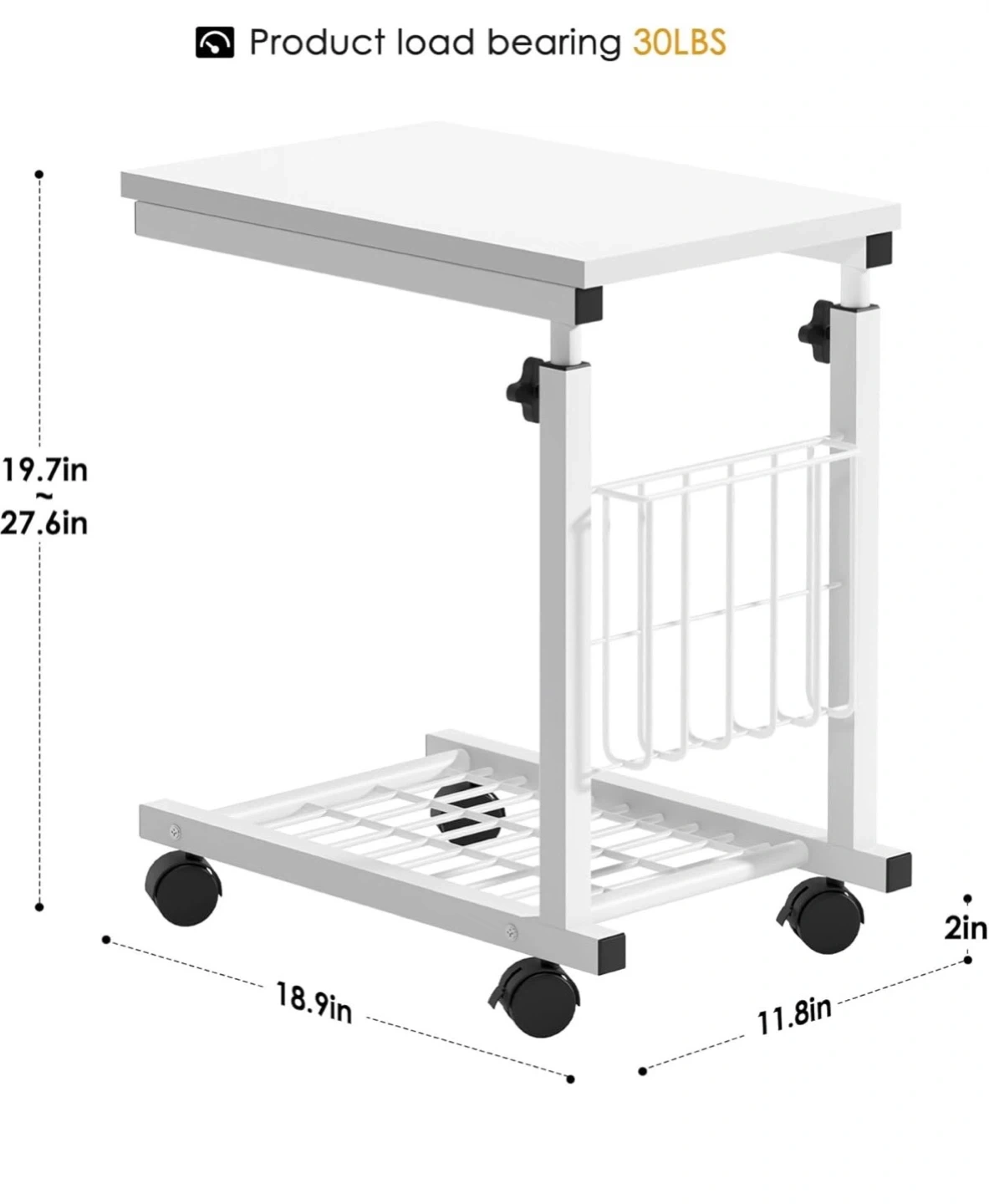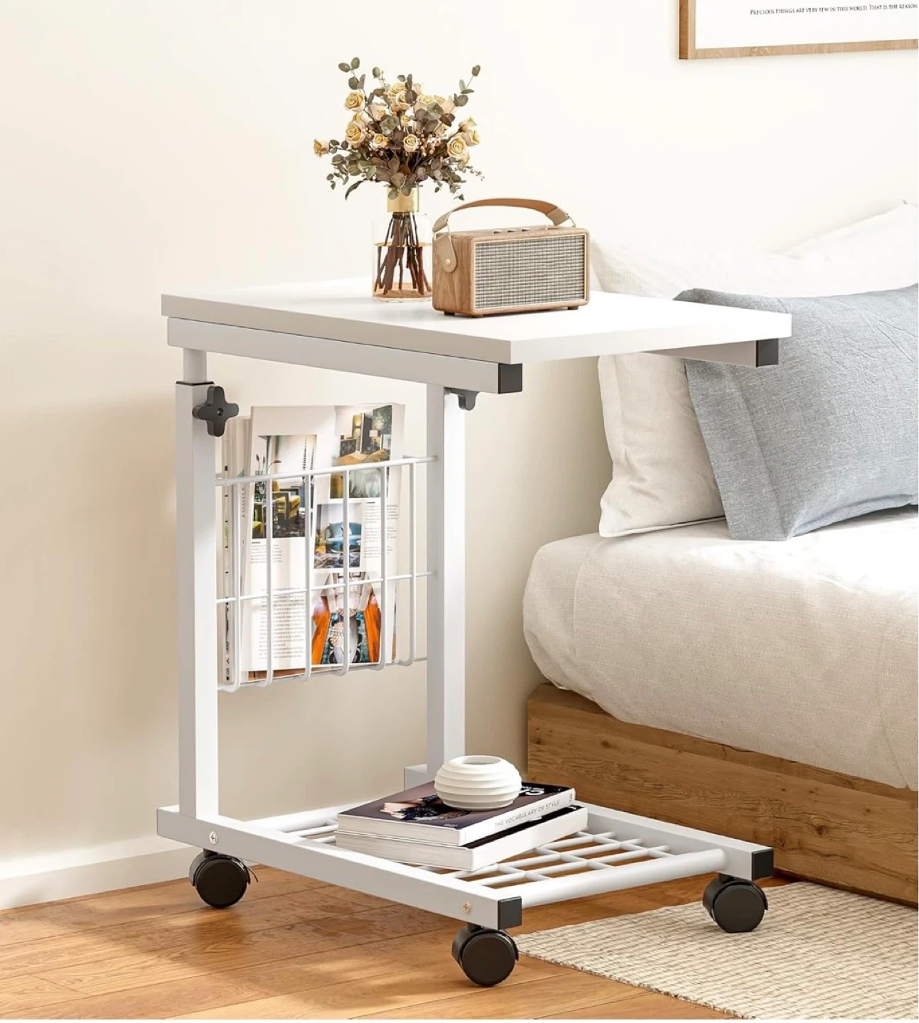 This white rolling table features an adjustable height and a handy lower shelf. It's great for use next to a bed or couch. The metal frame includes a wire rack for extra storage.