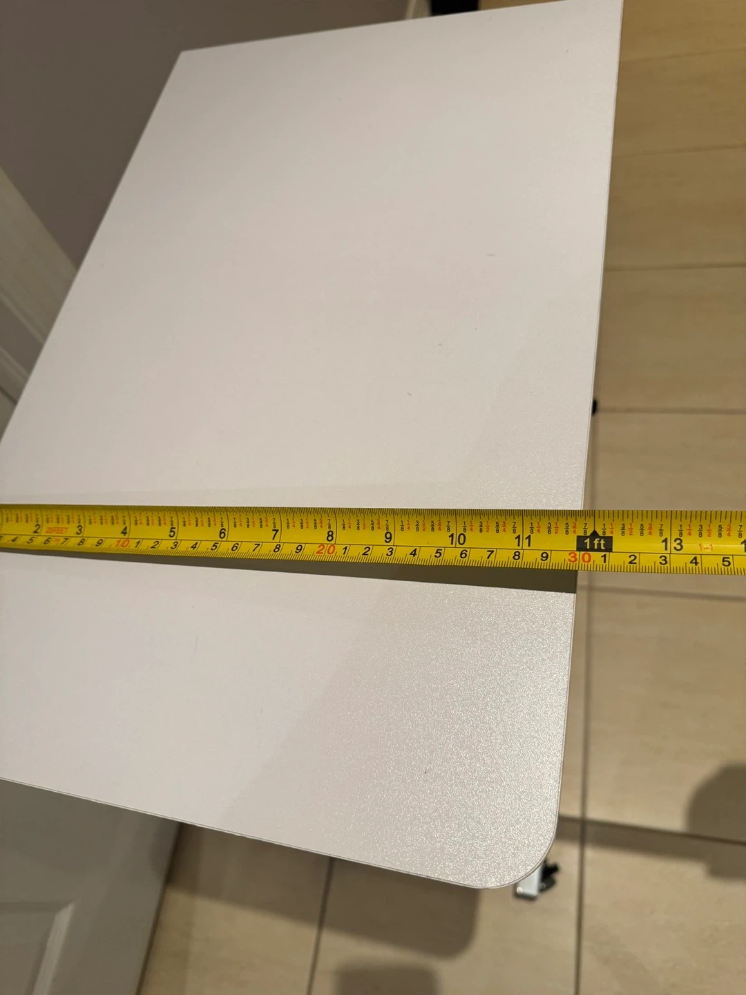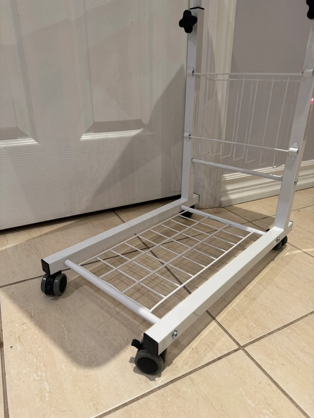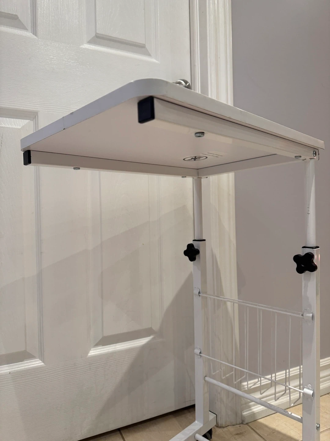This white rolling table features an adjustable height and a handy lower shelf. It's great for use next to a bed or couch. The metal frame includes a wire rack for extra storage.