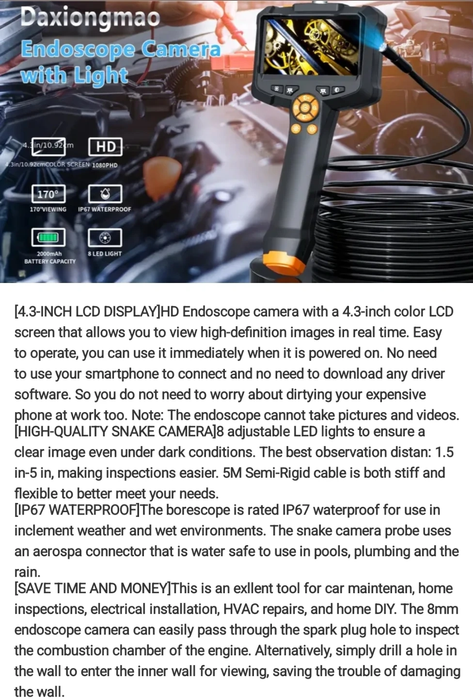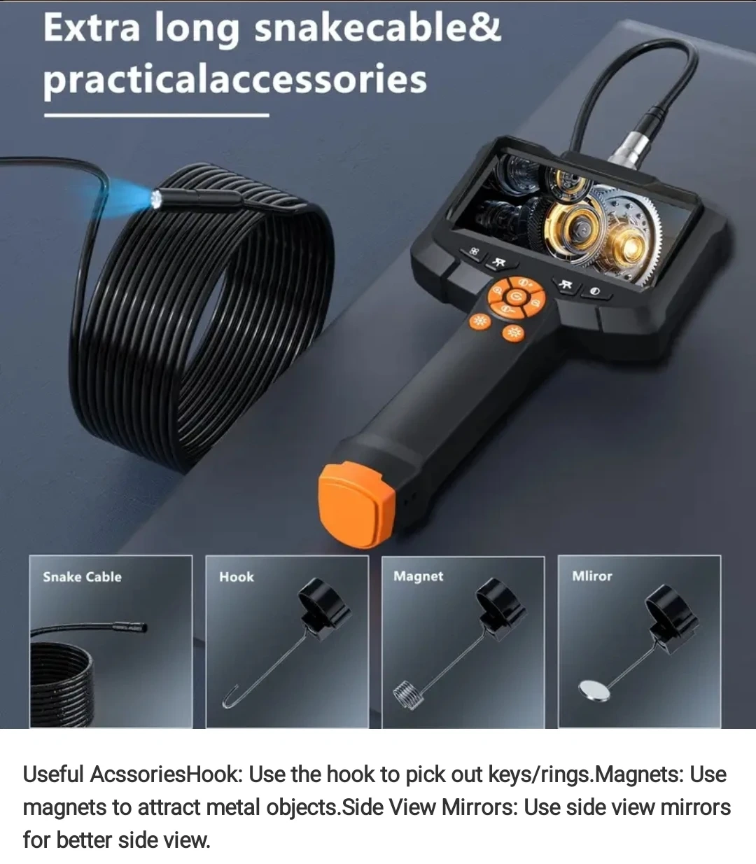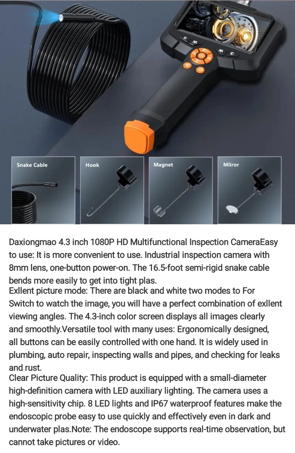 Industrial Borescope, 4.3" Endoscope Camera with Light, IP67 Waterproof Endoscope, 1080 HD Inspection Camera, Borescope Camera with Light, Snake Camera, 16.5ft Endoscope Camera. Brand new. Great for checking in walls, under decks, great for mechanics, plumbers, or dyi jobs. basically anywhere where you cant reach. Comes with a magnetic tip , hook, and mirror attachments. $90
