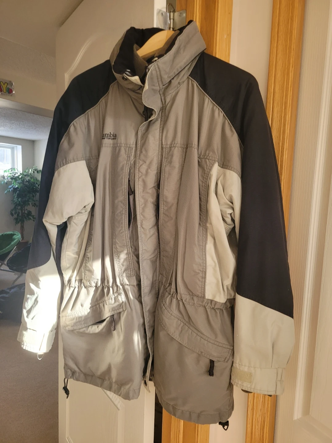 This Columbia jacket features a grey, black, and light beige colour scheme. It's a size L with multiple pockets.