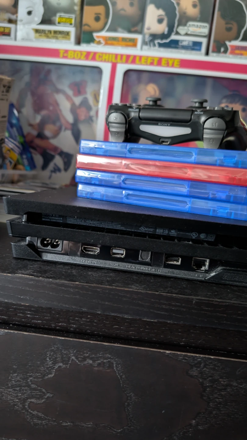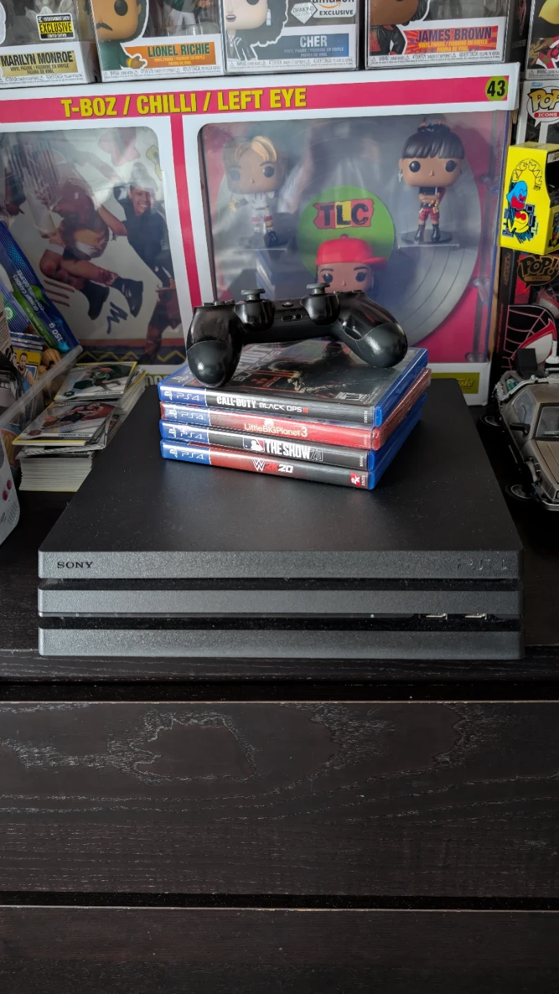 Selling a Sony PlayStation 4 Pro console. It comes with one black DualShock 4 controller and four games. Games included are Call of Duty: Black Ops III, LittleBigPlanet 3 (sealed), WWE 2K20, and The Show 20.