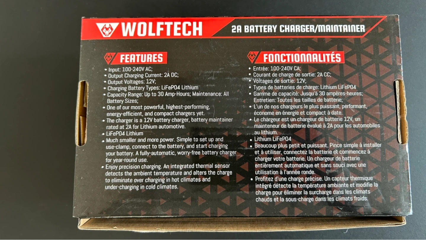 This WOLFTECH 2A battery charger and maintainer is designed for 6V/12V Lead-Acid, AGM, and 12V Lithium batteries. It offers simple setup and connection for charging your battery. The integrated thermal sensor precisely detects ambient temperature and alters the charge to eliminate over-charging in hot climates and under-charging in cold climates.