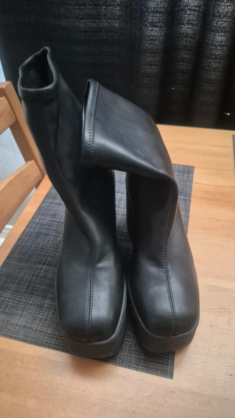 These black ankle boots feature a chunky heel and platform sole. They're made from a faux leather material with a pull-on style. The lug sole provides good traction.