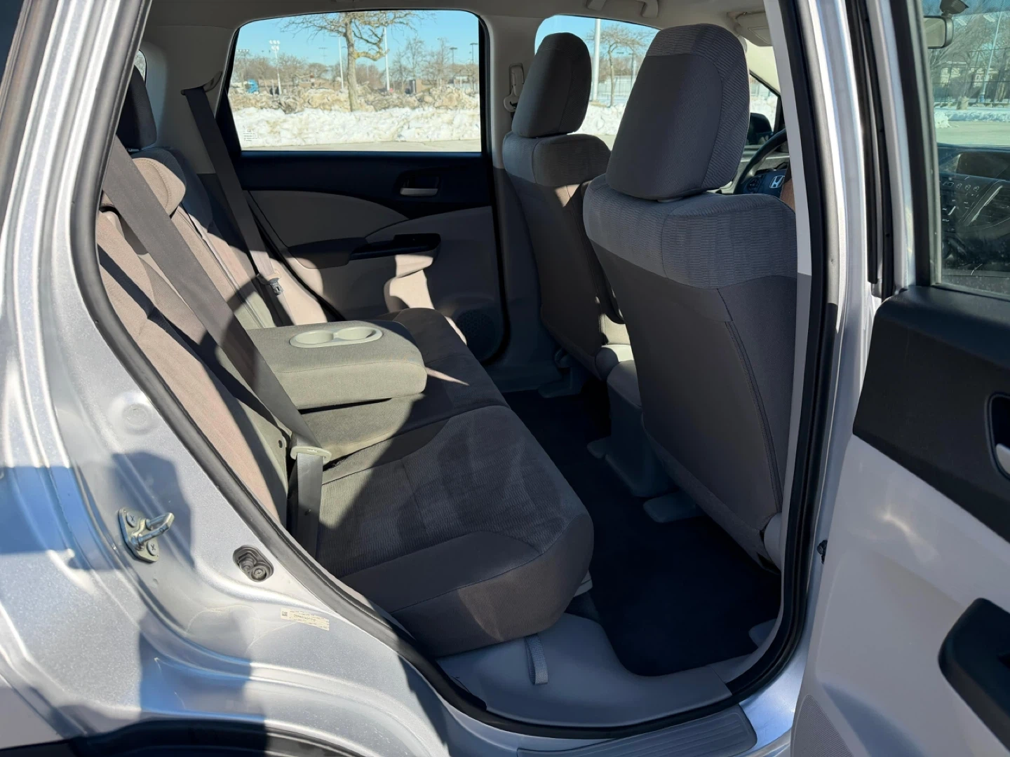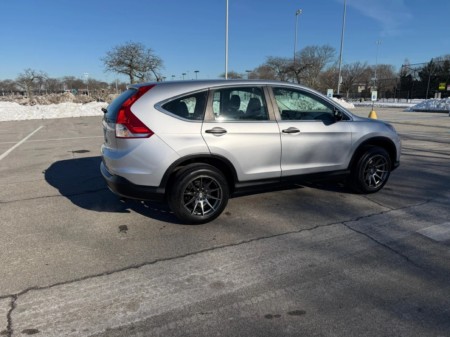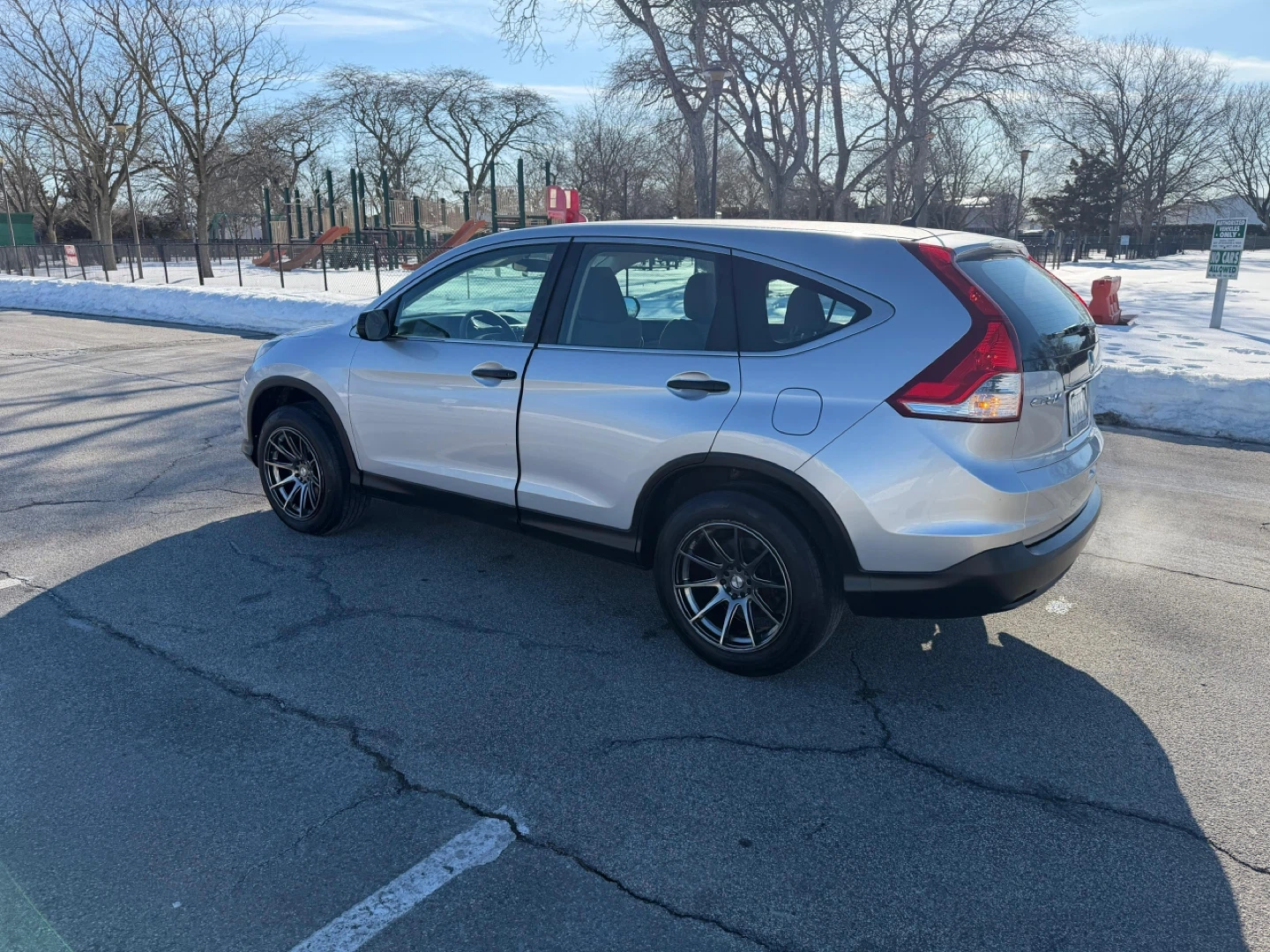 This silver 2014 Honda CR-V LX is a reliable SUV. It features a comfortable interior with cloth seats and has custom aftermarket wheels. This vehicle is ready for its next adventure!