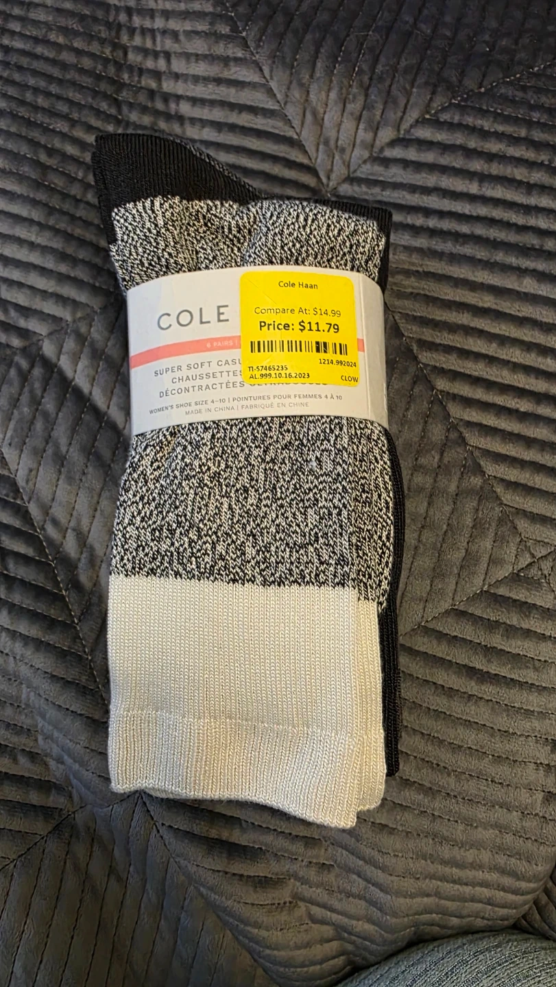 This is a pack of Cole Haan soft stretch socks for women. The size is 4-10. They are made with a blend of materials for comfort. Machine wash cold inside out.