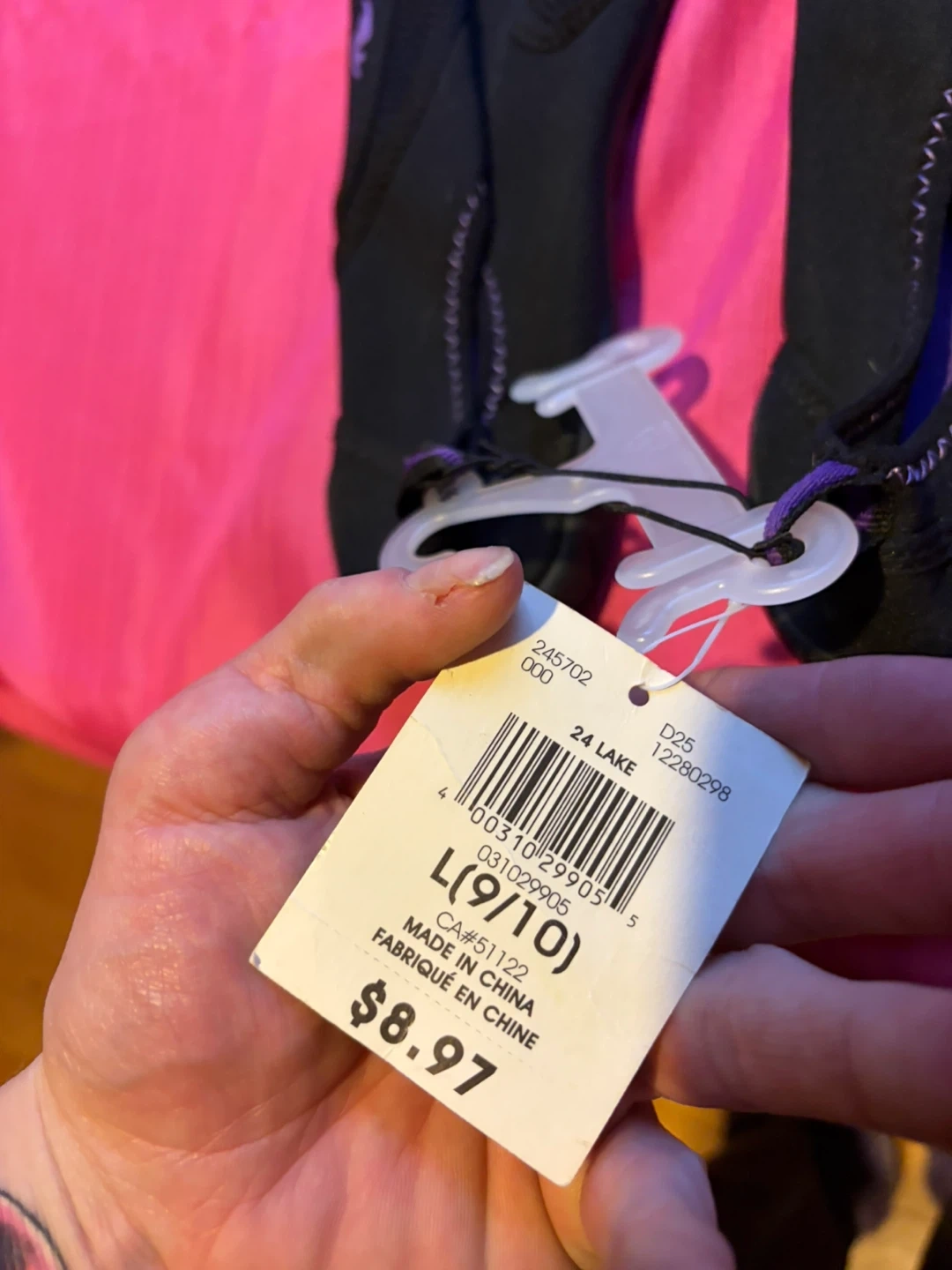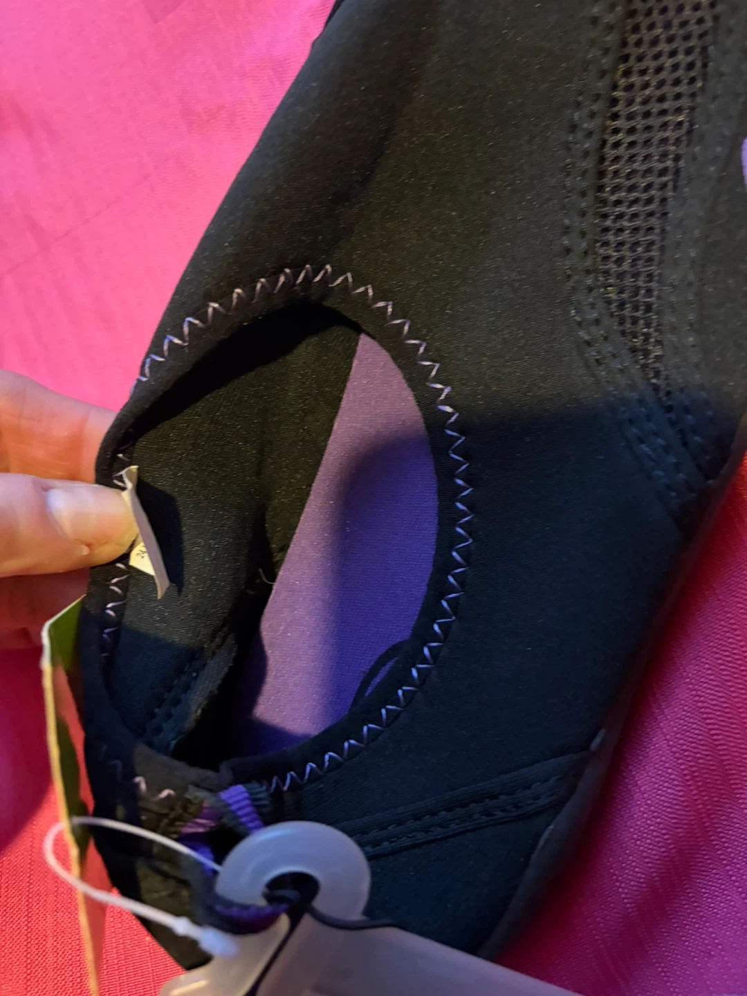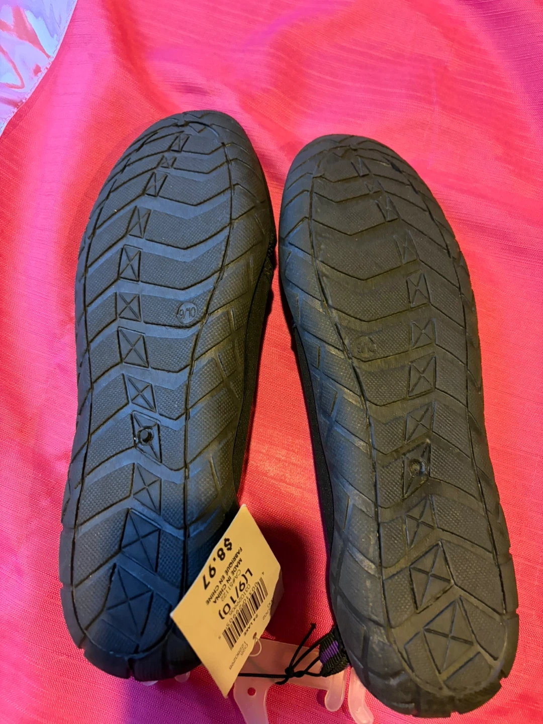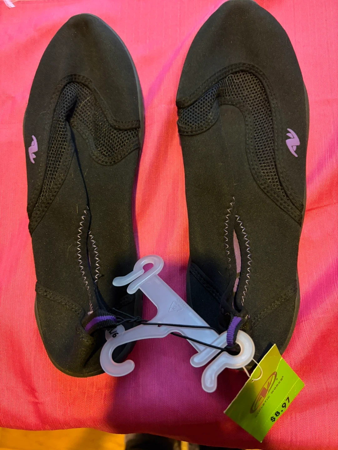 These black water shoes are from Athletic Works in size L (9/10). They're made of neoprene-like material with mesh panels for breathability. The flexible rubber sole offers good traction.