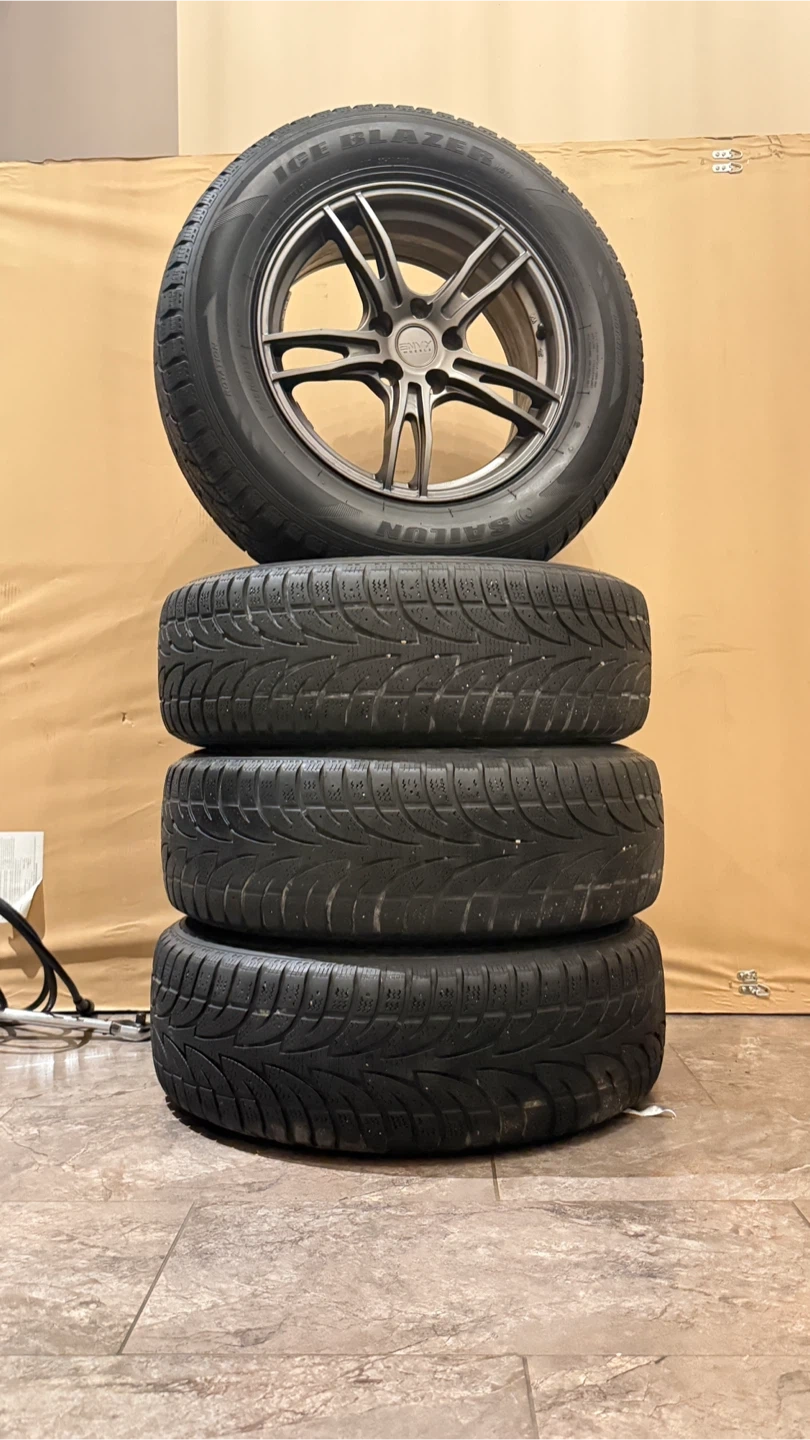 Four envy rims 5x114.3 Plus 225/65R17 Sailun Ice Blazer Winter tires mounted on alloy rims. These are winter tires and ready for the season. Tread depth appears good on all tires. Full set of 4