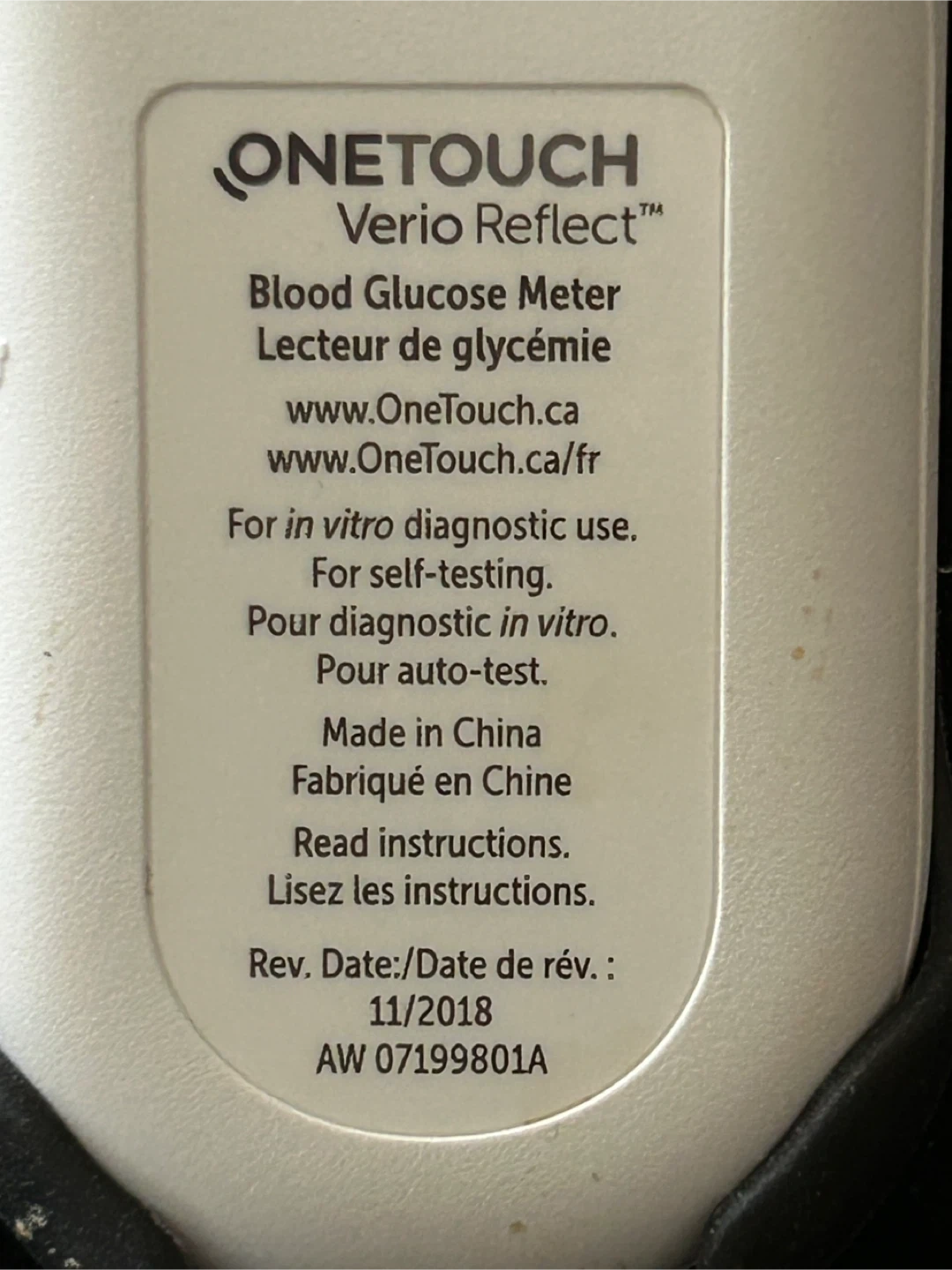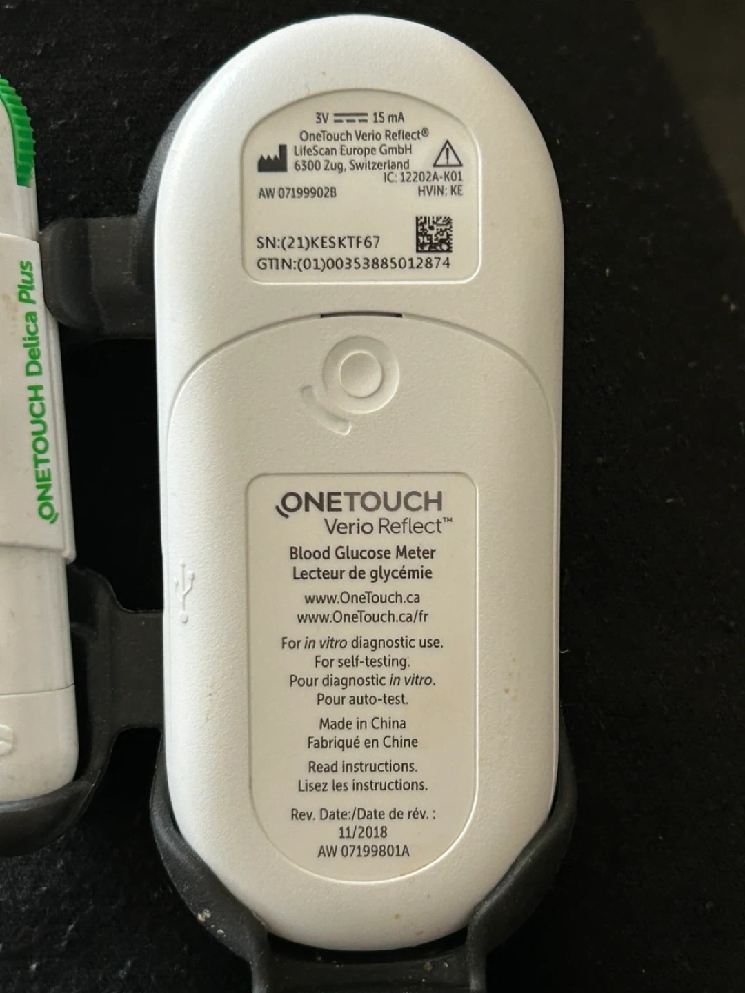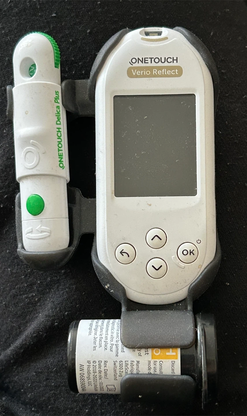 OneTouch Verio Reflect blood glucose meter. Includes meter, lancing device, and container of 50 test strips with an expiry date of 11/2025.