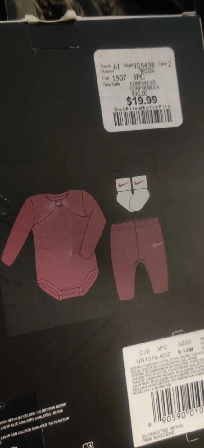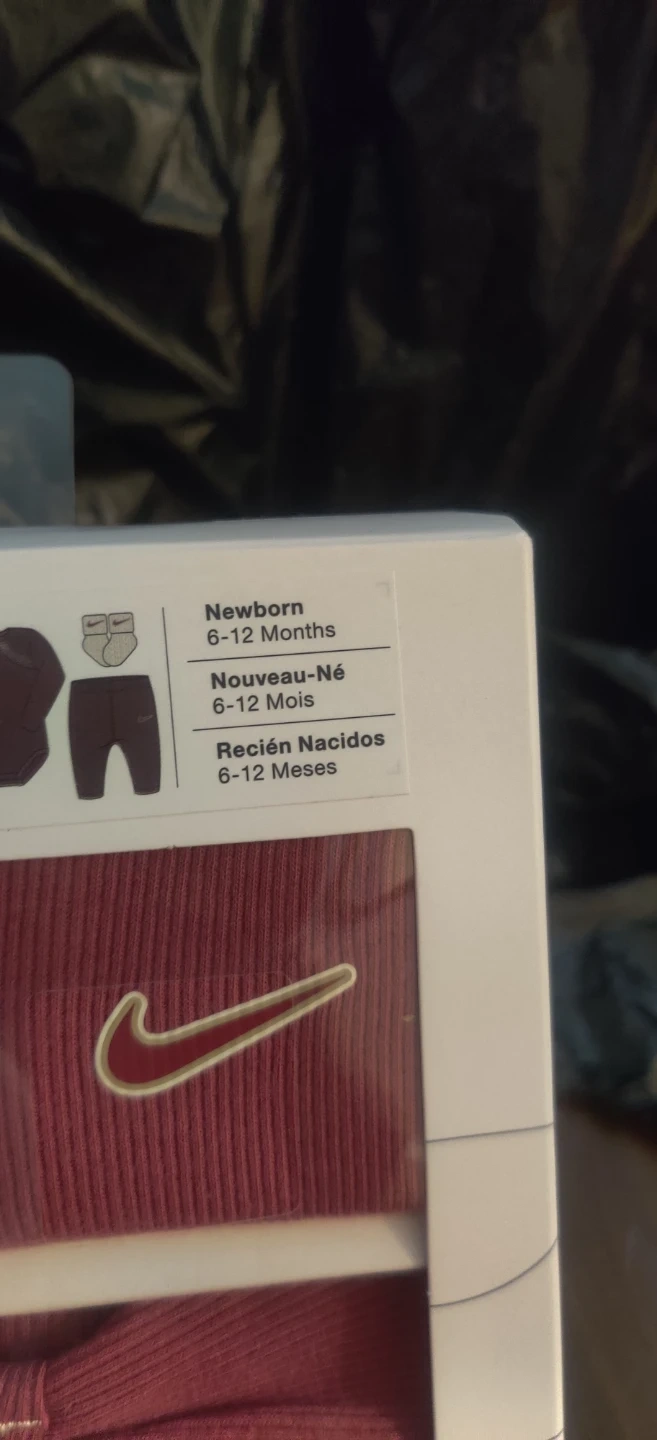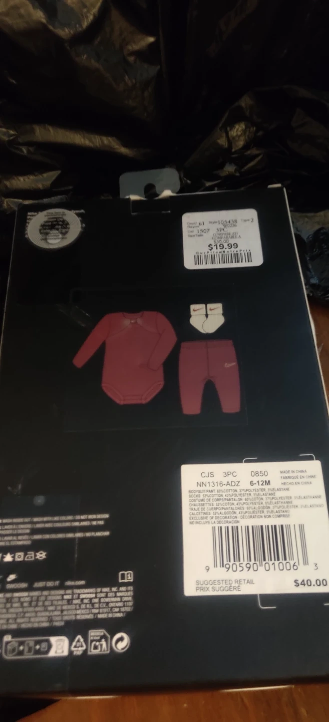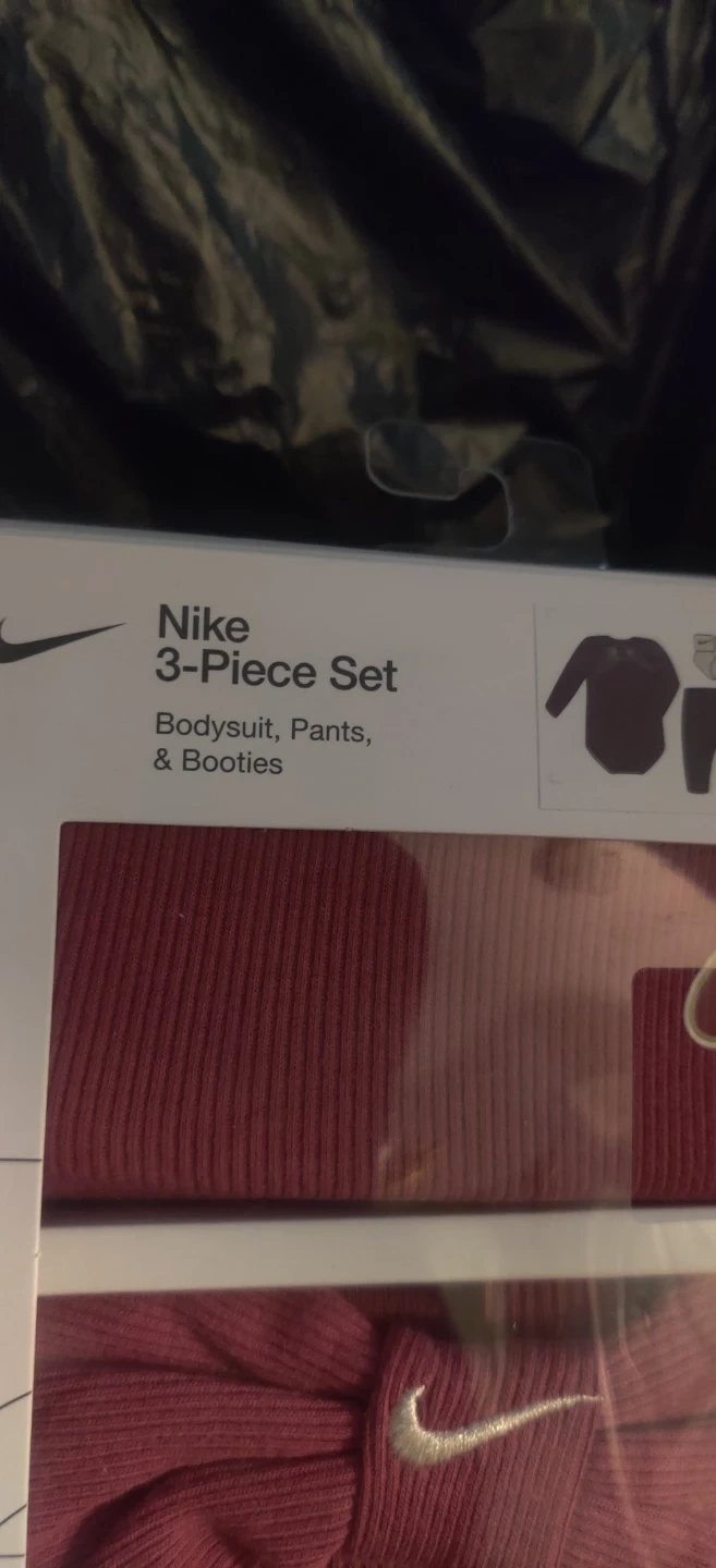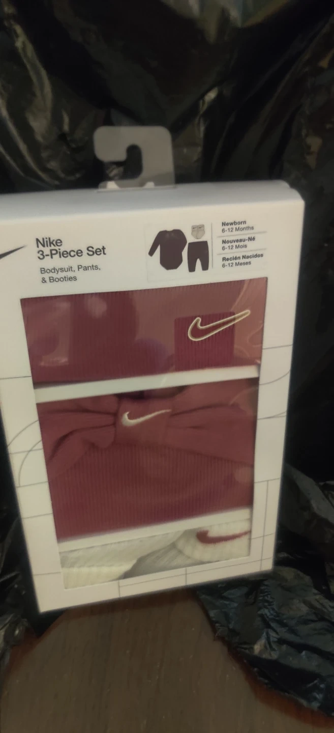 This Nike 3-piece set includes a bodysuit, pants, and booties. It's designed for babies aged 6-12 months. The set is made from a blend of cotton and polyester.If interested please check for availability when you are able to pick up