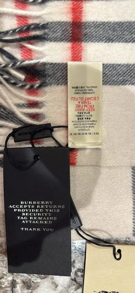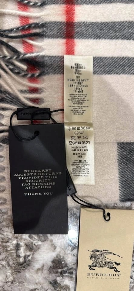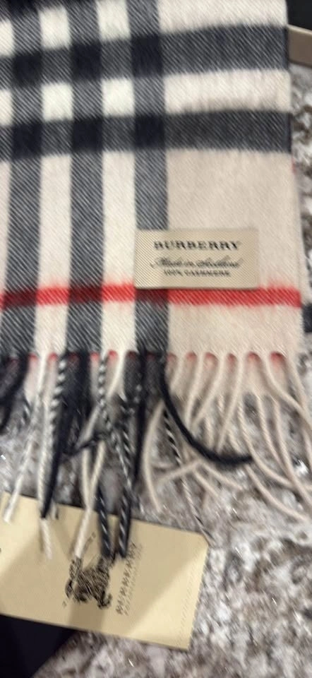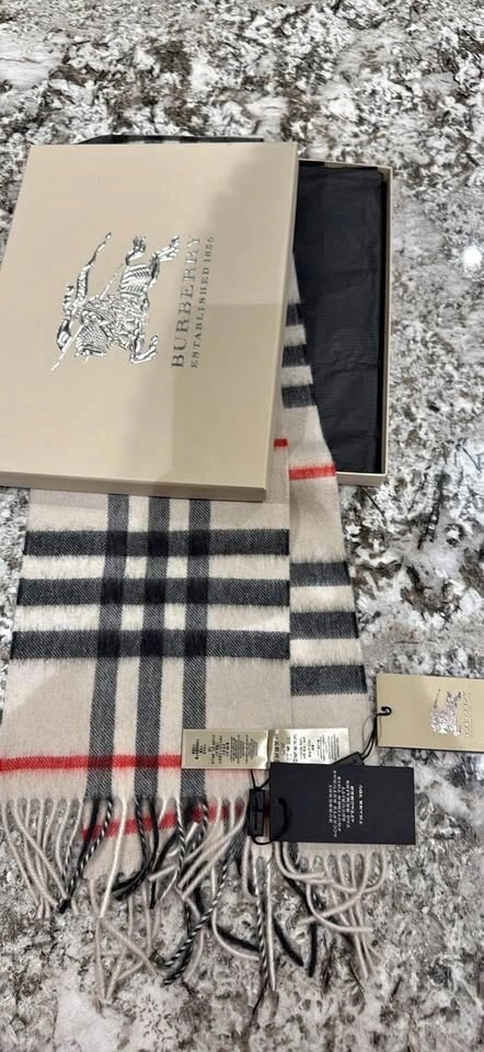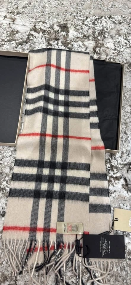 Wrap yourself in luxury with this authentic Burberry scarf, crafted from 100% cashmere in Scotland. This scarf features the iconic Burberry check pattern with fringed ends. It's brand new in excellent condition. Original box, perfect for gifts.