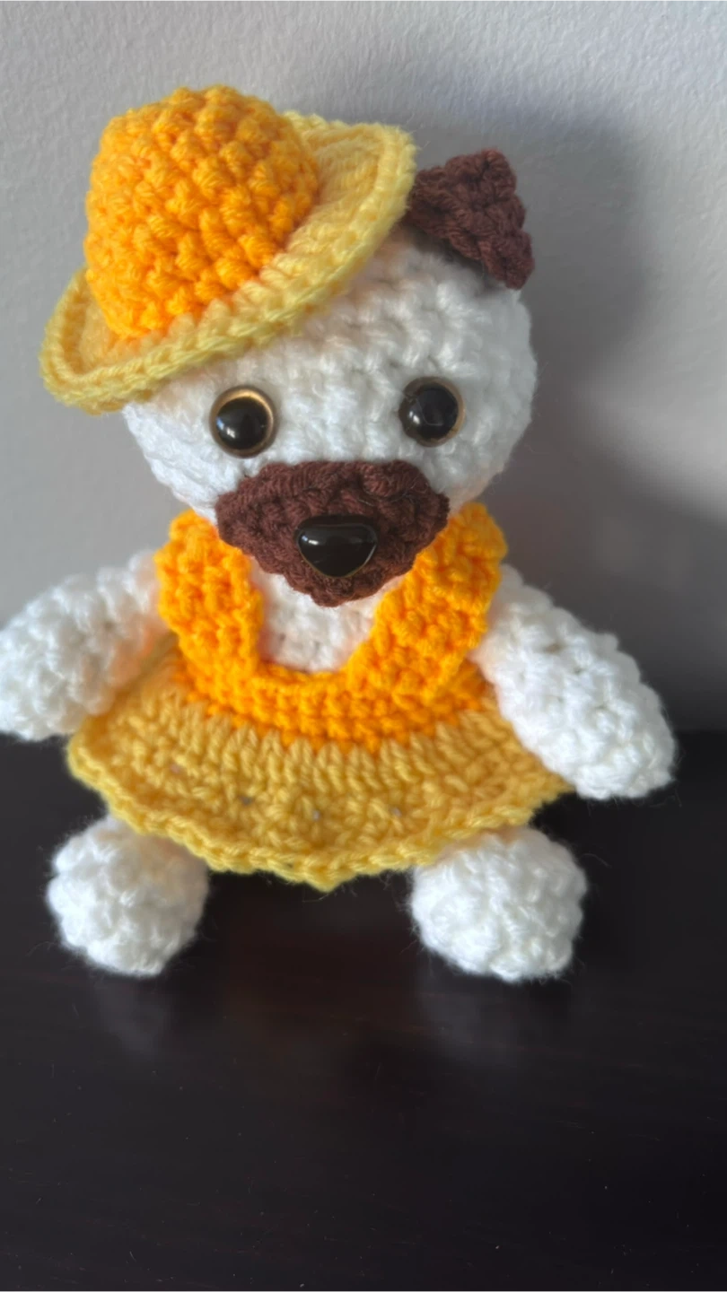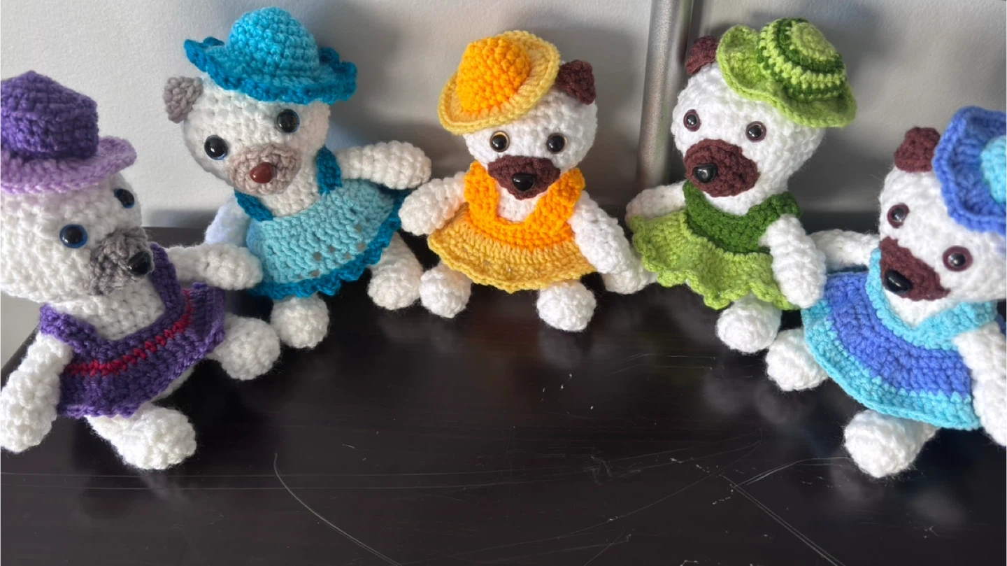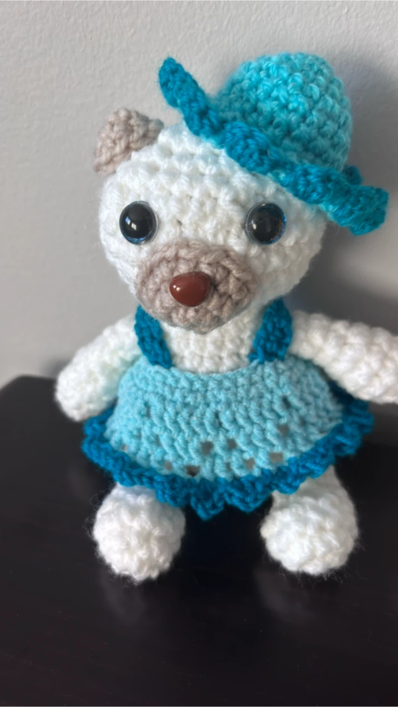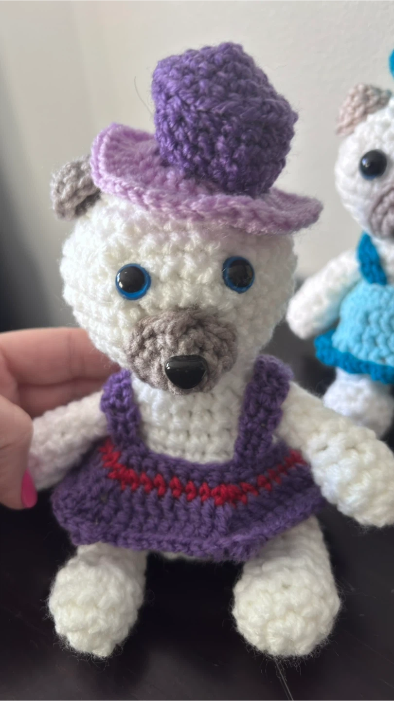 Set of five adorable crochet teddy bears, each with a unique, colourful handmade outfit and hat. These charming little bears are perfect for decoration or as a special gift for someone who loves handmade items. Made from soft yarn.