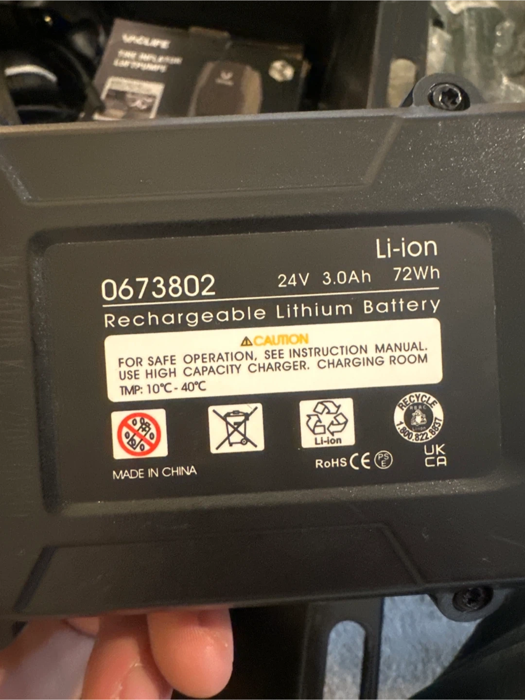 Rechargeable Lithium Battery. 24V 3.0Ah 72Wh. For safe operation, see instruction manual. Use high capacity charger. Charging room temp: 10°C - 40°C. Made in China.