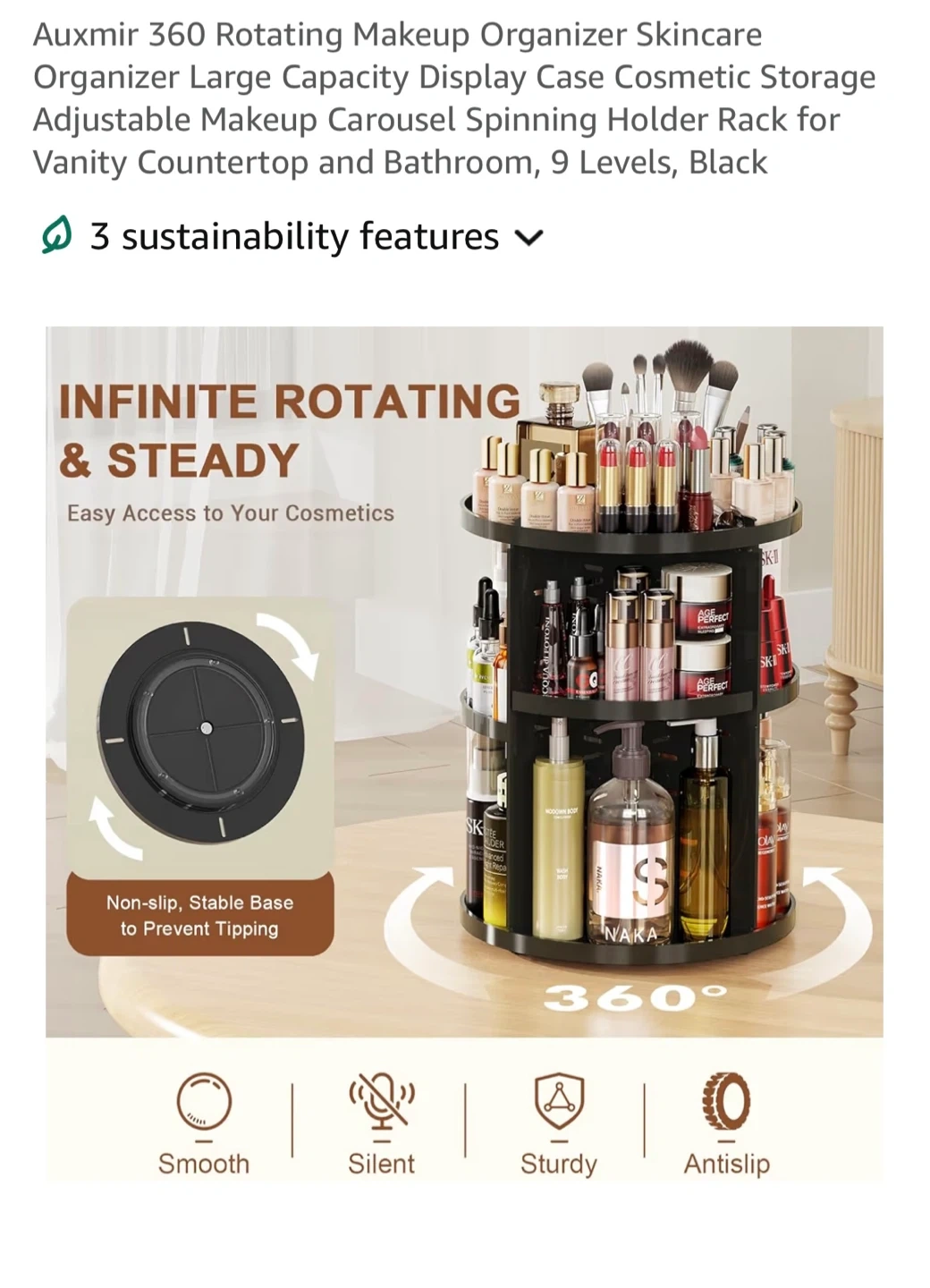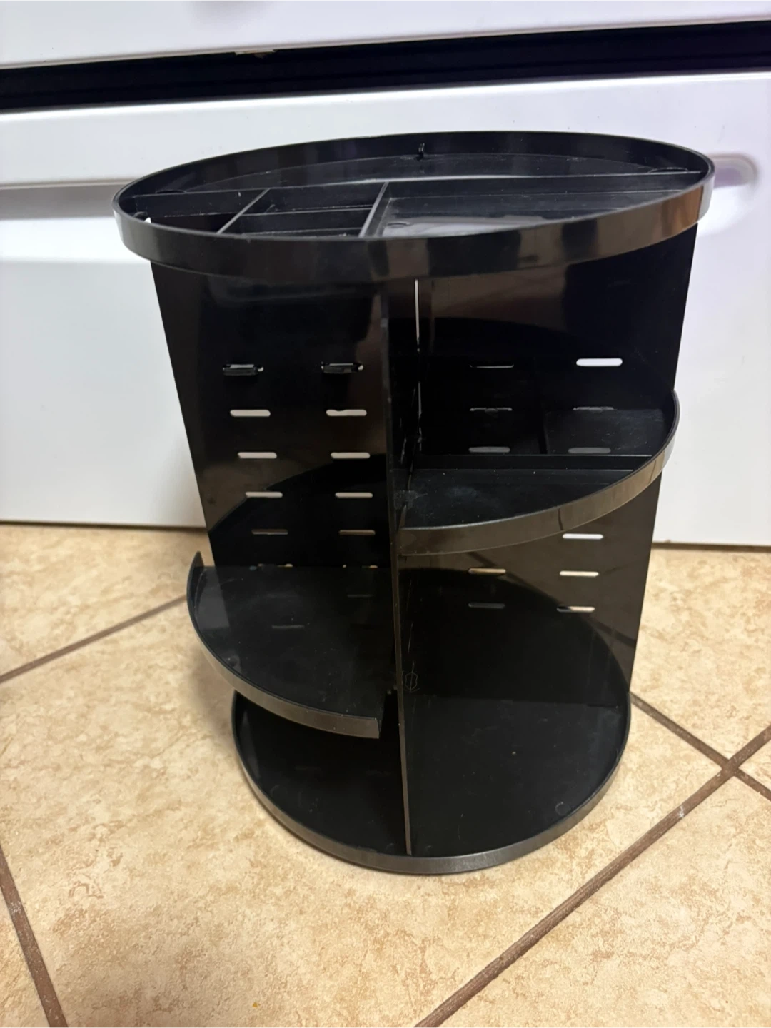 Black rotating makeup organizer with adjustable levels. It has multiple compartments for storing cosmetics and skincare products. Perfect for a vanity countertop or bathroom.
