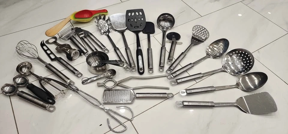 Large bundle of kitchen utensils in good condition. Includes: Ladles & serving spoons, Slotted spoons & spatulas, Pasta server, Whisk, Measuring cups & spoons, Peeler, grater & opener, Tongs, Garlic press, And more. Most pieces are stainless steel and sturdy. Perfect starter set for new home, condo, or rental.