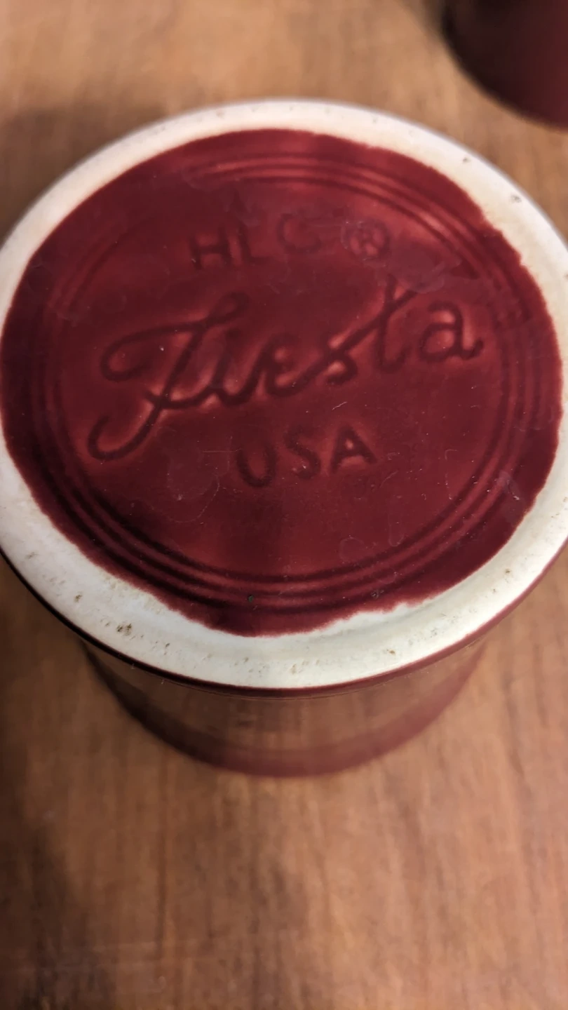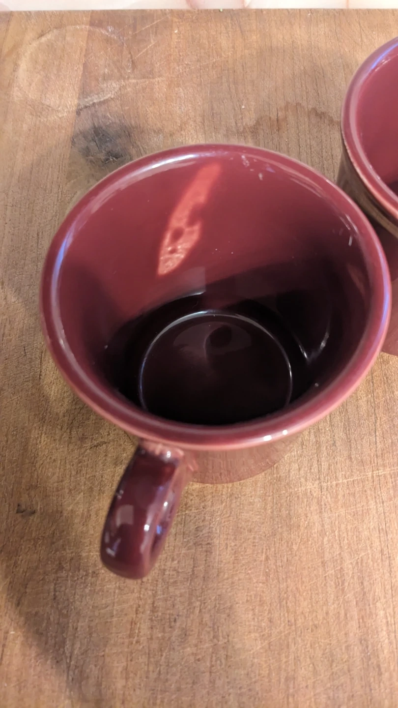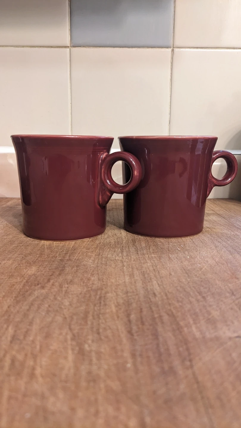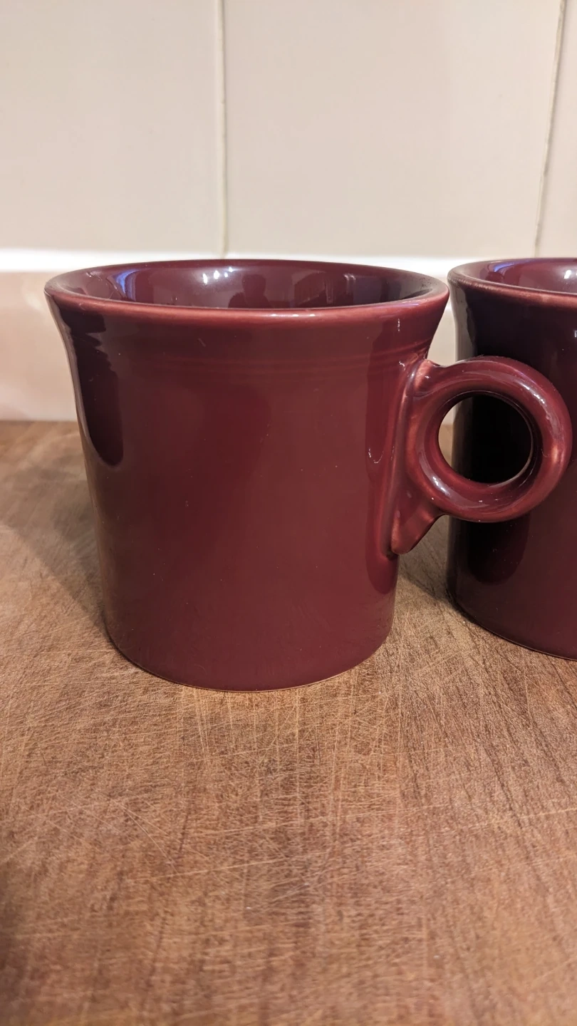 Two Fiesta burgundy ceramic mugs. Dishwasher and microwave safe. Perfect for your morning coffee or tea!