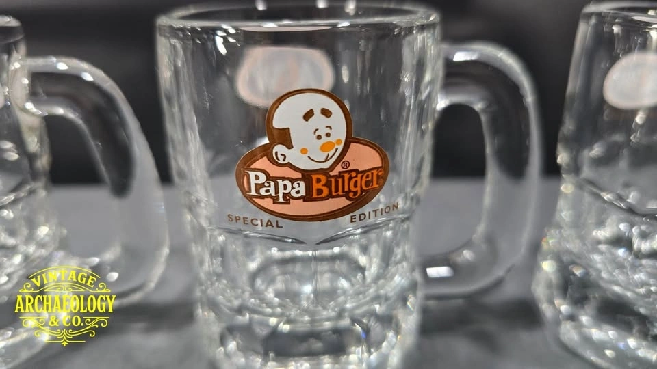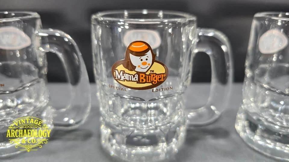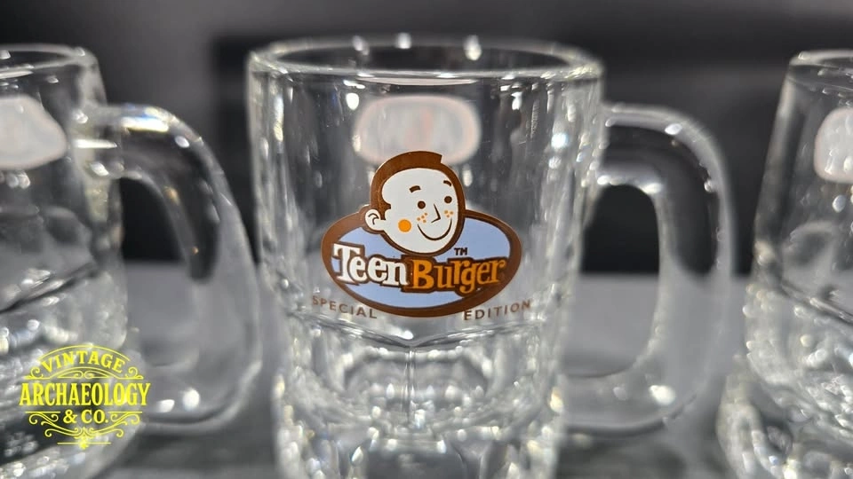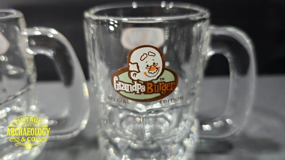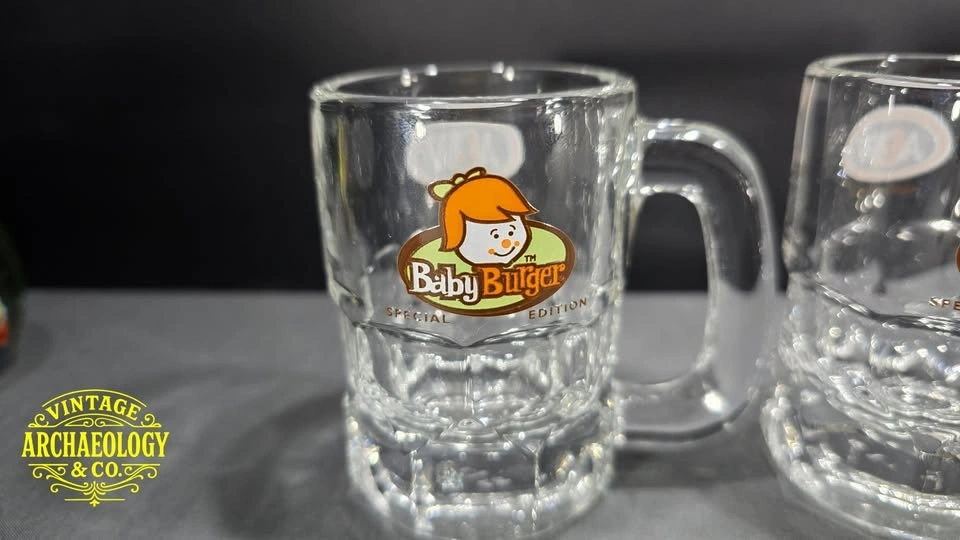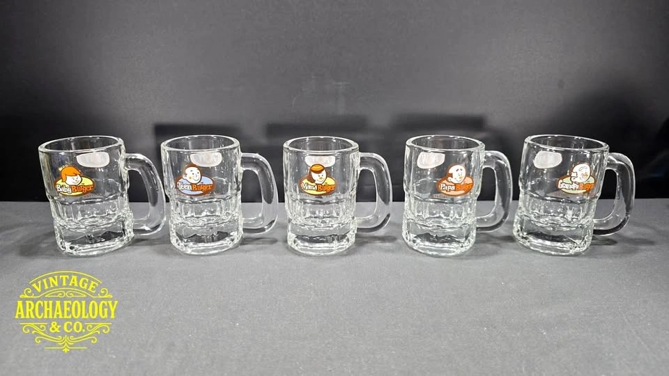 Relive 1990s nostalgia with this rare set of five A&W Canada "Burger Family" promotional glass mugs - featuring Baby, Teen, Mama, Papa, and Grandpa Burgers in vibrant cartoon style. Great for collectors and retro root beer fans.