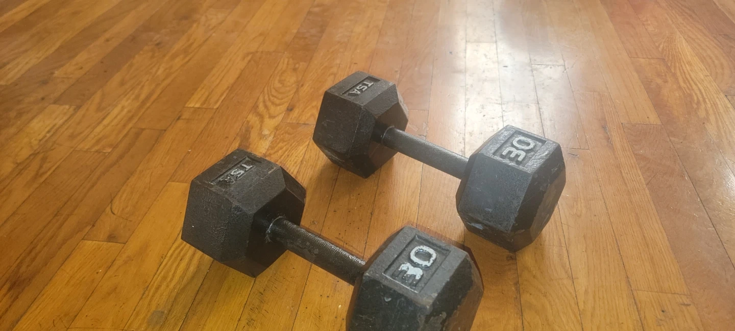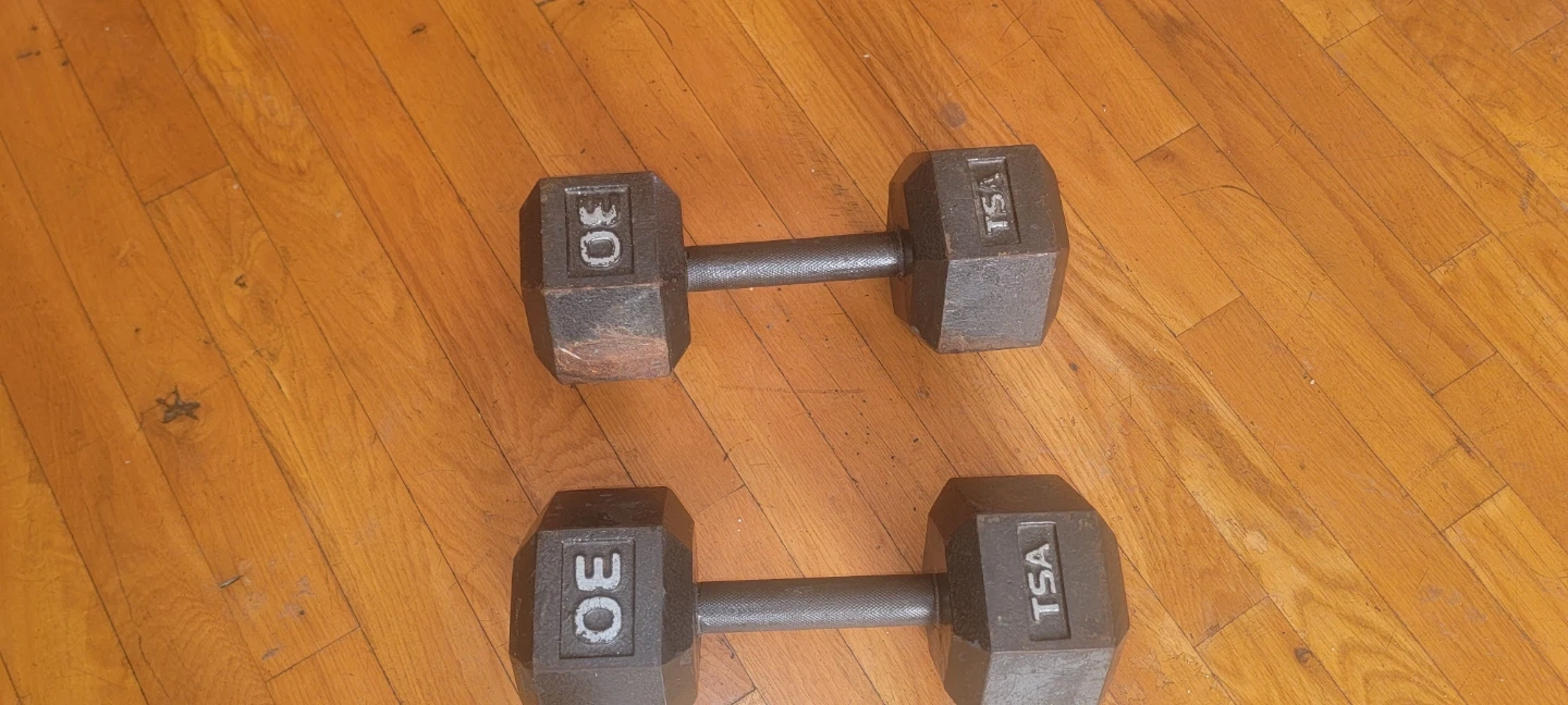 Pair of 30lb hex dumbbells from TSA. These are solid cast iron weights. They're great for strength training and can be used for a variety of exercises. Needs clean and polished. Great condition