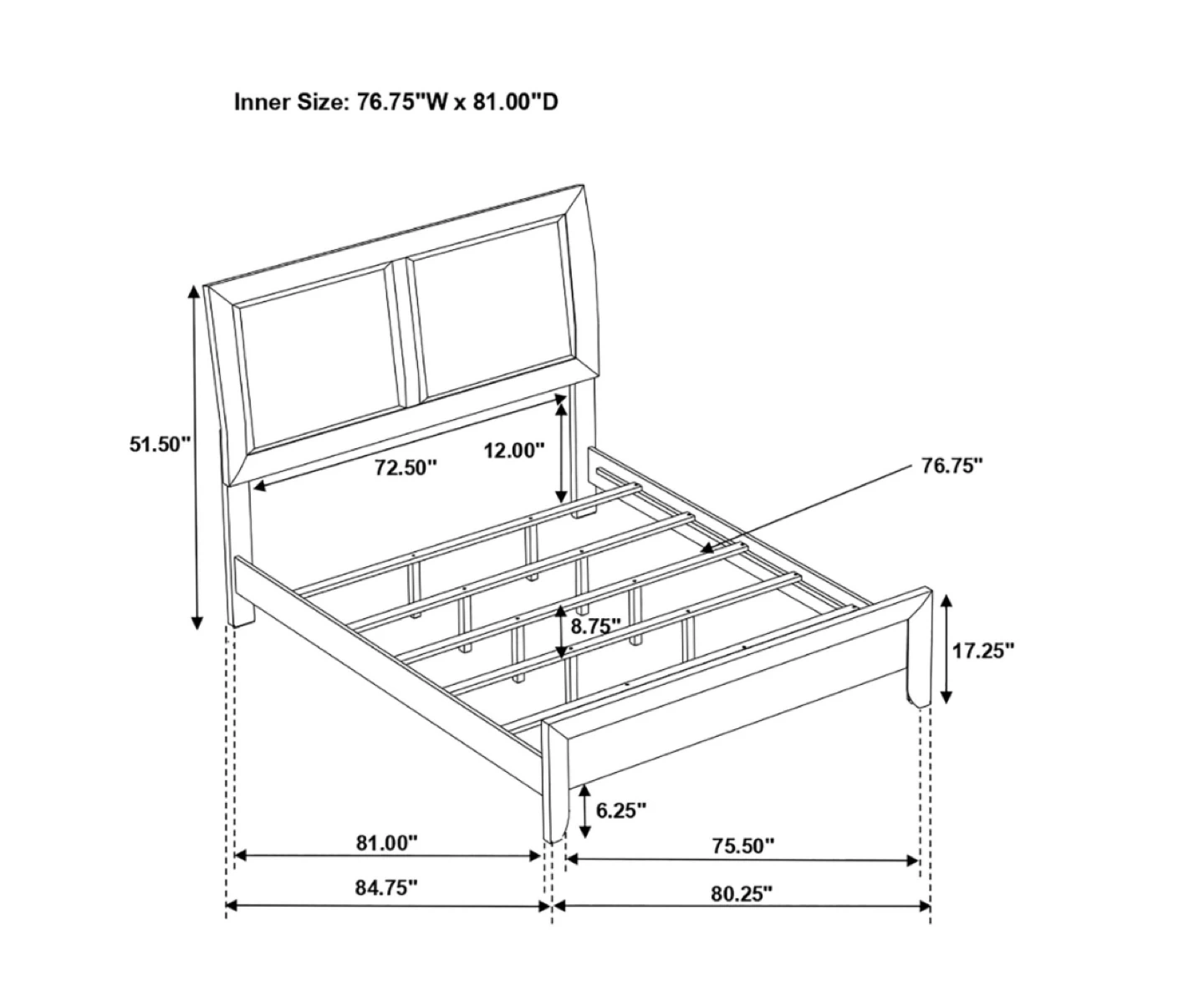 It’s a queen size and the headboard is padded and looks really nice in person. The frame is strong and doesn’t wobble at all.