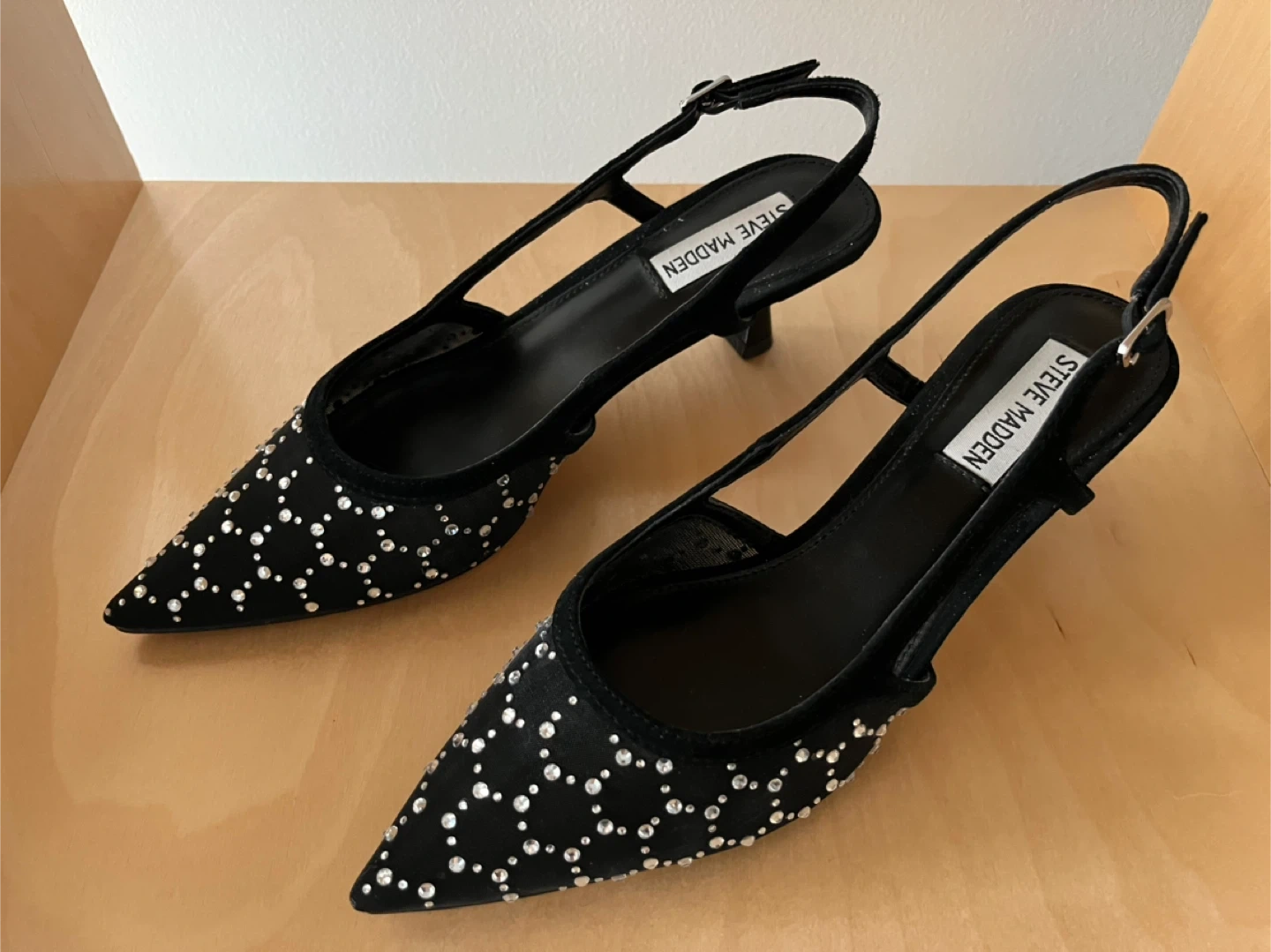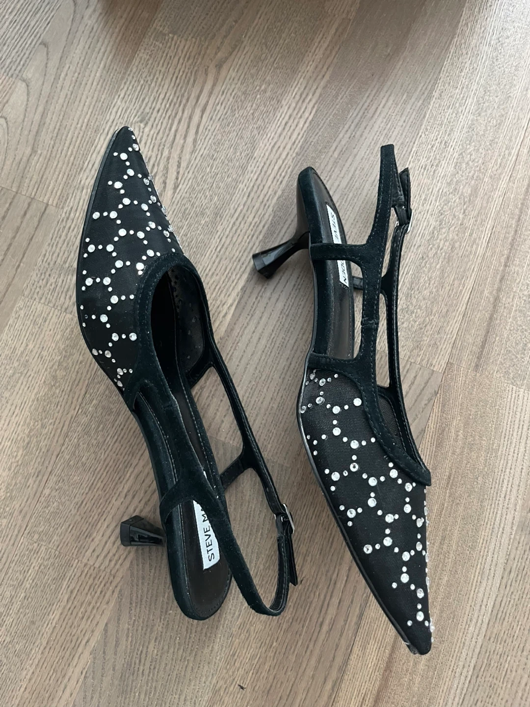 Beautiful Steve Madden black slingback heels with a pointed toe and rhinestone embellishments. Buckle strap.