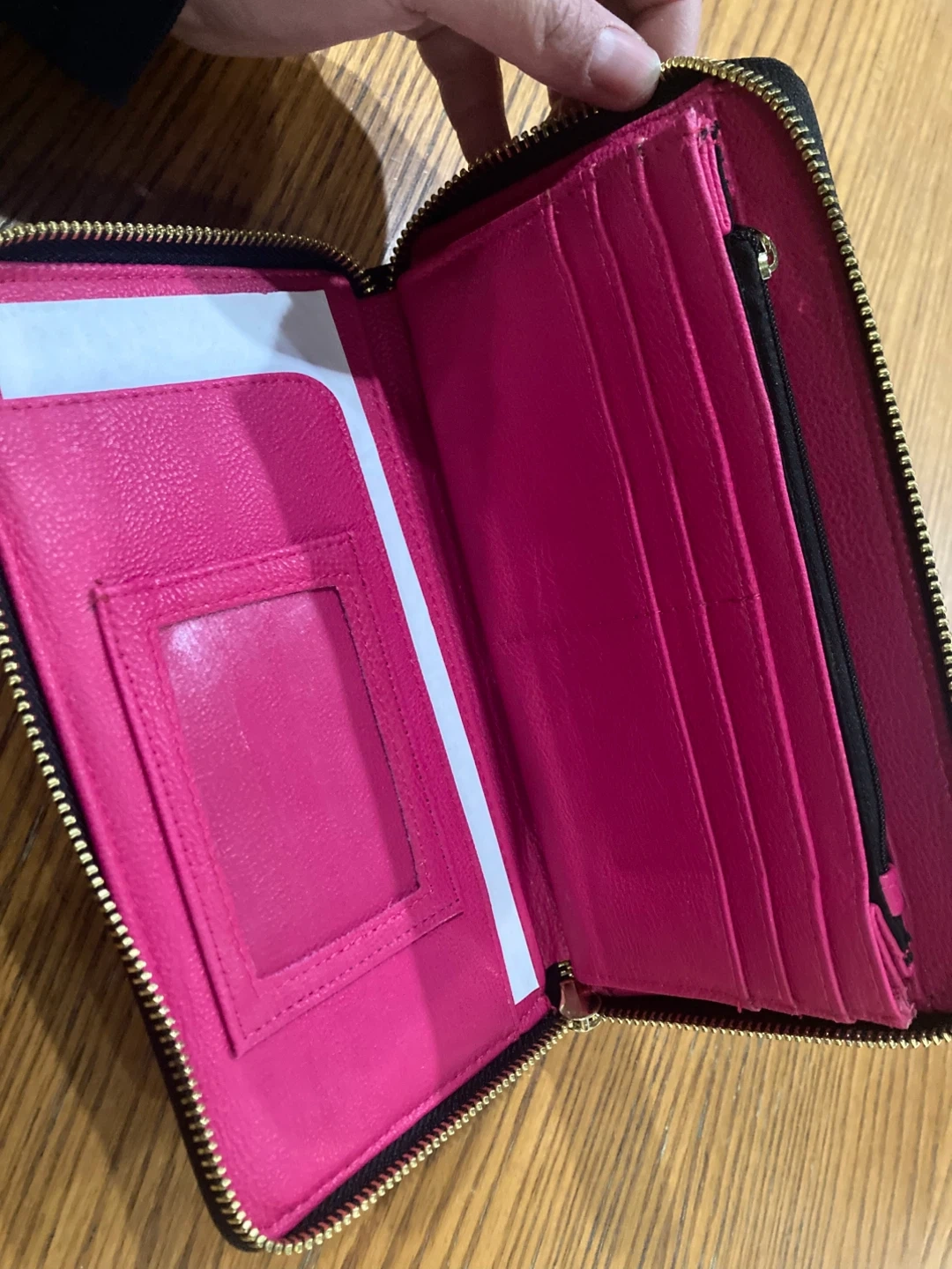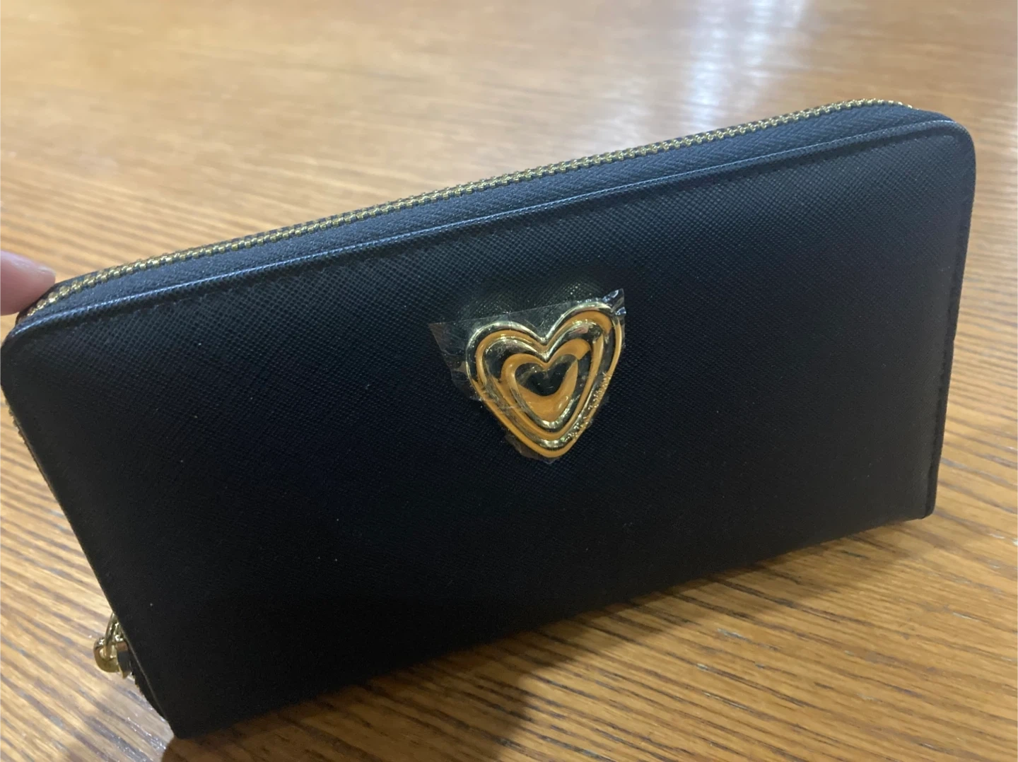 Brand new! This black zip-around wallet features a gold heart detail on the front. The interior is a bright pink with multiple card slots and a zippered compartment. It's a stylish and practical accessory for everyday use.