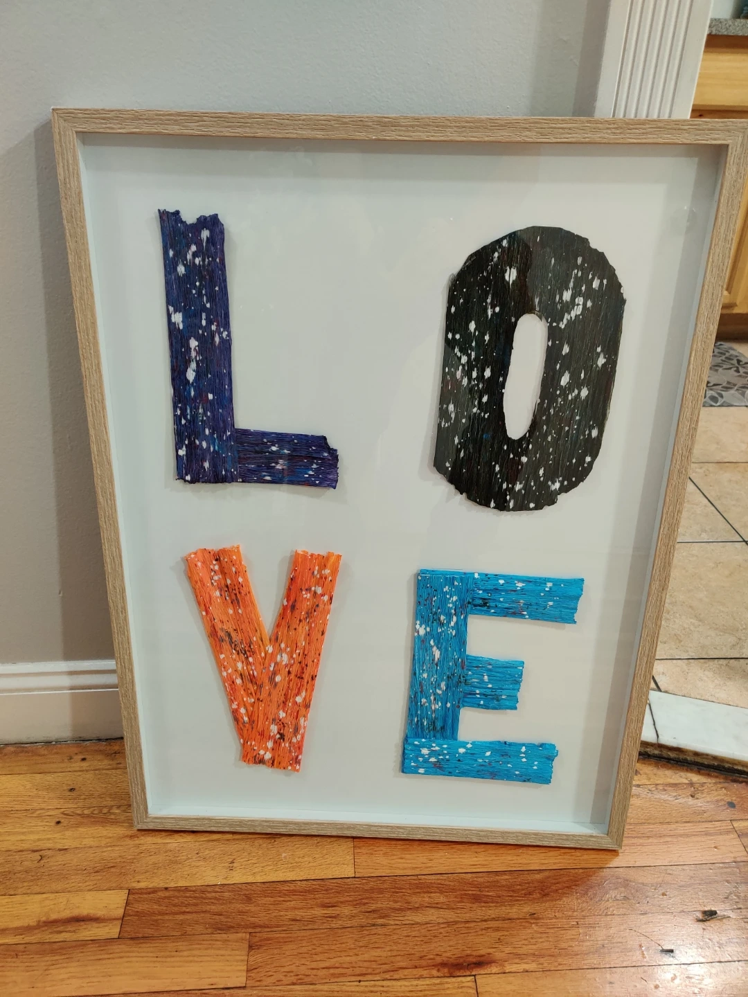 This is a framed wall art piece that spells out the word "LOVE" with textured letters. The letters are colored blue, black, orange, and turquoise, and the frame is a light wood color. It's a cute and colorful addition to any room!