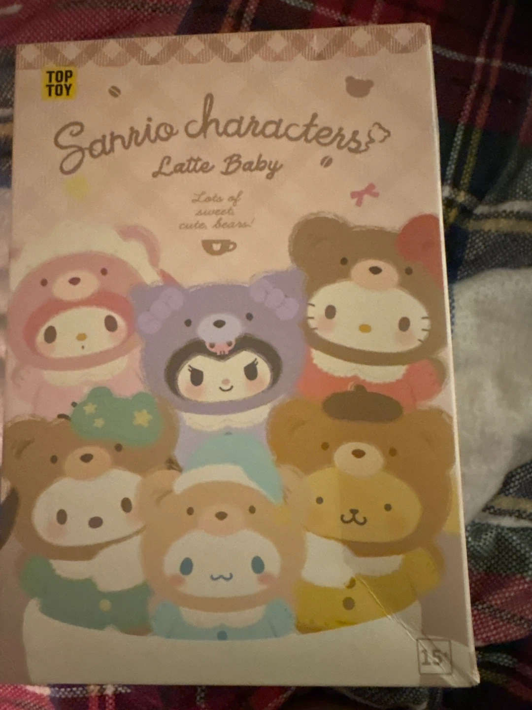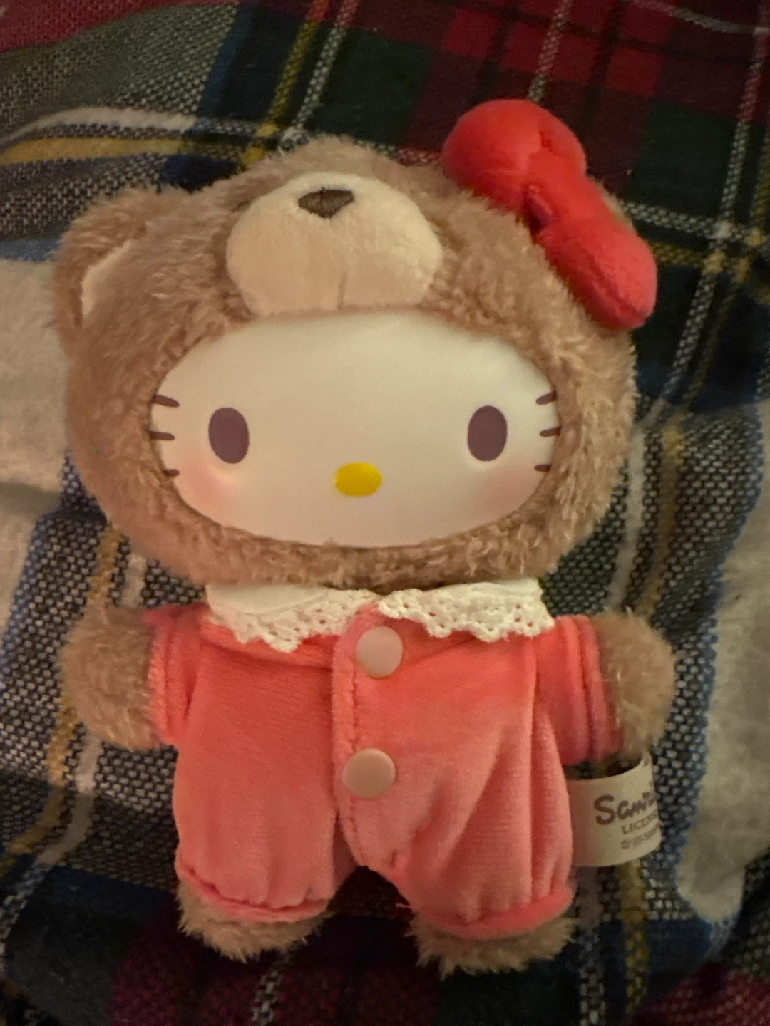 This is a cute Sanrio Characters Latte Baby plush toy featuring Hello Kitty dressed in a bear costume. It's made of soft, fuzzy material and has a sweet outfit. A delightful collectible for any Sanrio fan!