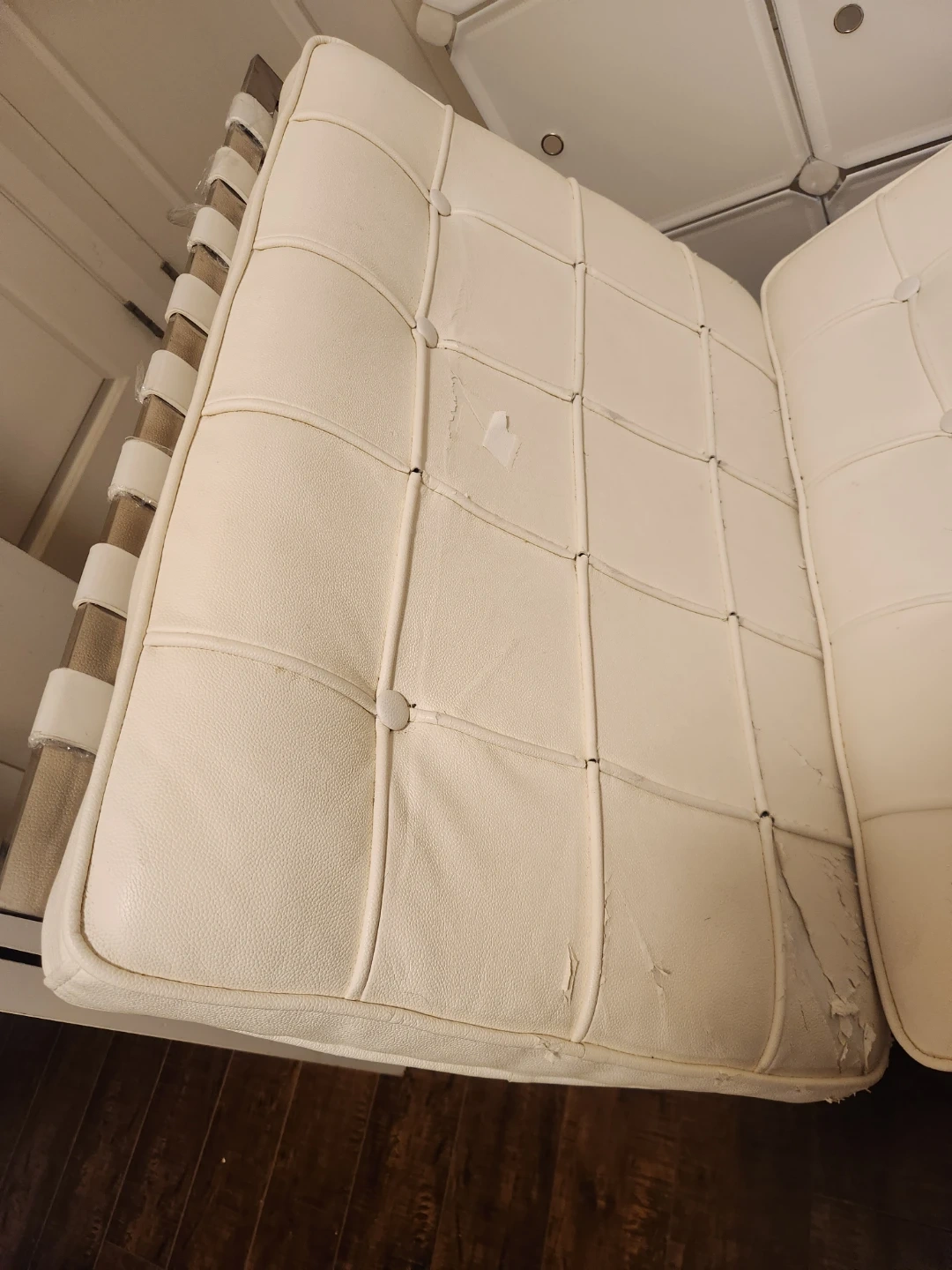 White leather Barcelona chair with chrome frame. Some wear and tear visible on the leather. It's a stylish and iconic chair.