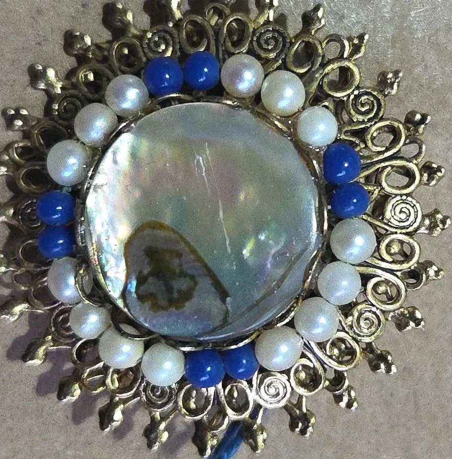 This unique vintage brooch features a large, iridescent mother of pearl center stone. It's surrounded by a decorative gold-tone metal frame embellished with small white faux pearls and blue beads. It's a statement piece that adds a touch of retro flair to any outfit.