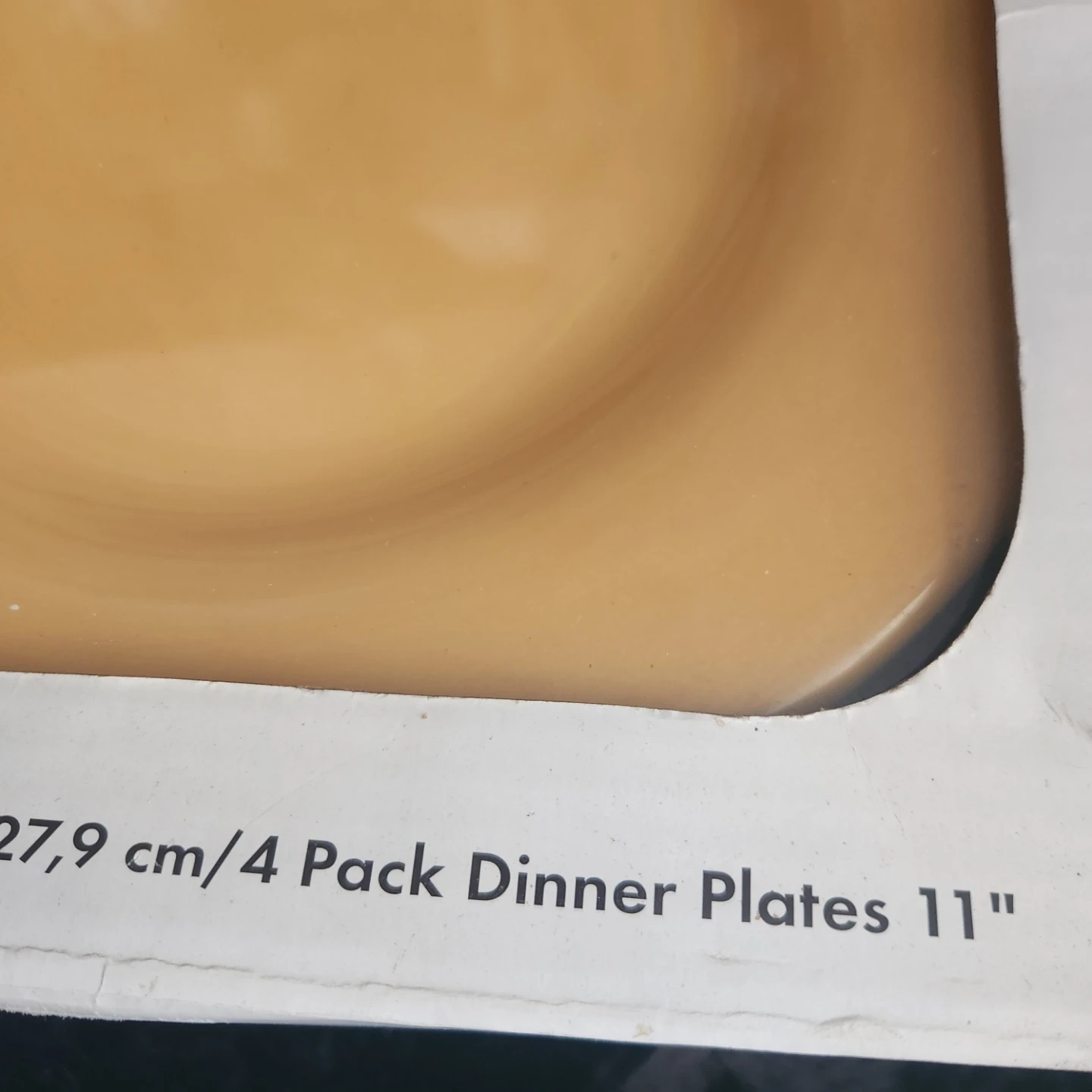 This is a 4 pack of 11-inch dinner plates from Barcelona Gold. They're dishwasher and microwave safe. Plates are 27.9 cm across. These plates are suitable for everyday use.