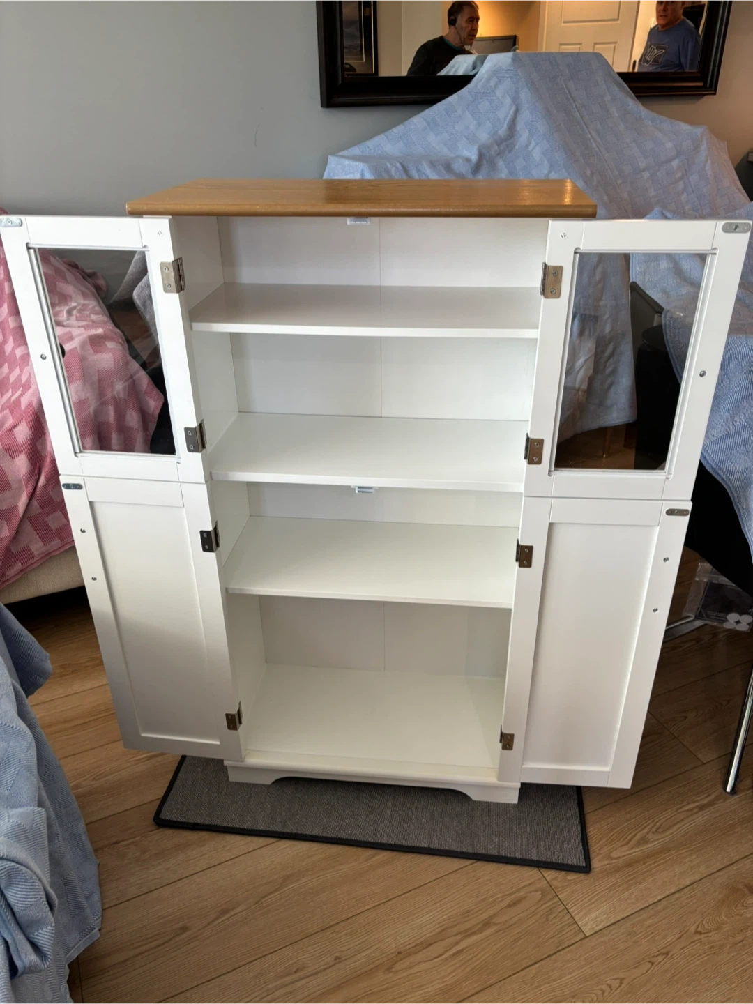 A charming white display cabinet featuring glass doors on the upper section and solid doors below. It has a natural wood top and offers ample shelving space for storage or display. This cabinet would be useful for organizing kitchenware or showcasing decorative items.